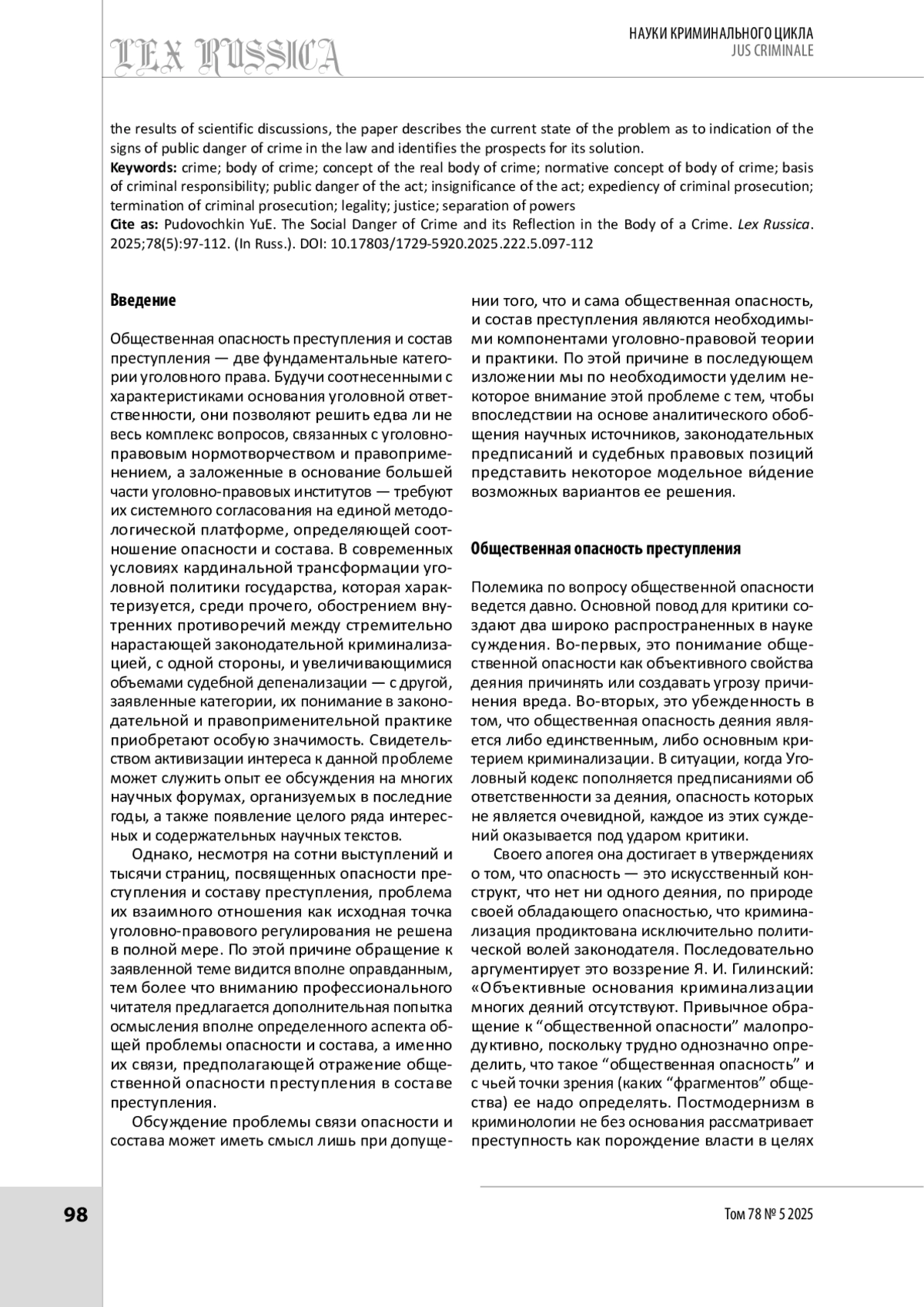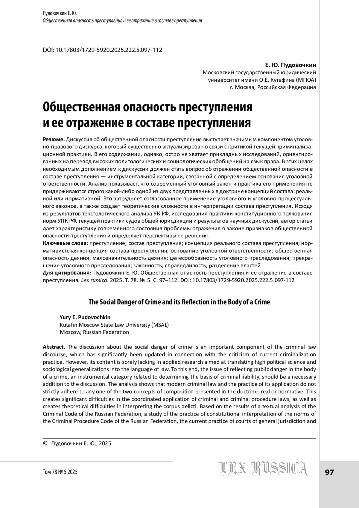 Дискуссия об общественной опасности преступления выступает значимым компонентом уголовно-правового дискурса, который существенно актуализирован в связи с критикой текущей криминализационной практики. В его содержании, однако, остро не хватает прикладных исследований, ориентированных на перевод высоких политологических и социологических обобщений на язык права. В этих целях необходимым дополнением к дискуссии должен стать вопрос об отражении общественной опасности в составе преступления — инструментальной категории, связанной с определением основания уголовной ответственности. Анализ показывает, что современный уголовный закон и практика его применения не придерживаются строго какой-либо одной из двух представленных в доктрине концепций состава: реальной или нормативной. Это затрудняет согласованное применение уголовного и уголовно-процессуального законов, а также создает теоретические сложности в интерпретации состава преступления. Исходя из результатов текстологического анализа УК РФ, исследования практики конституционного толкования норм УПК РФ, текущей практики судов общей юрисдикции и результатов научных дискуссий, автор статьи дает характеристику современного состояния проблемы отражения в законе признаков общественной опасности преступления и определяет перспективы ее решения.