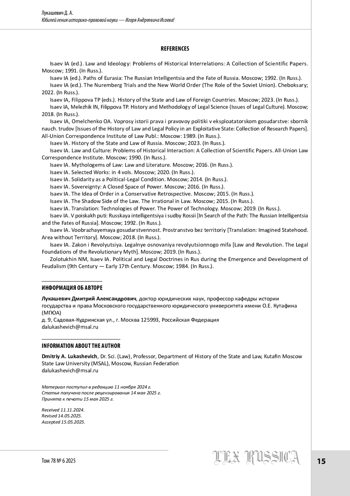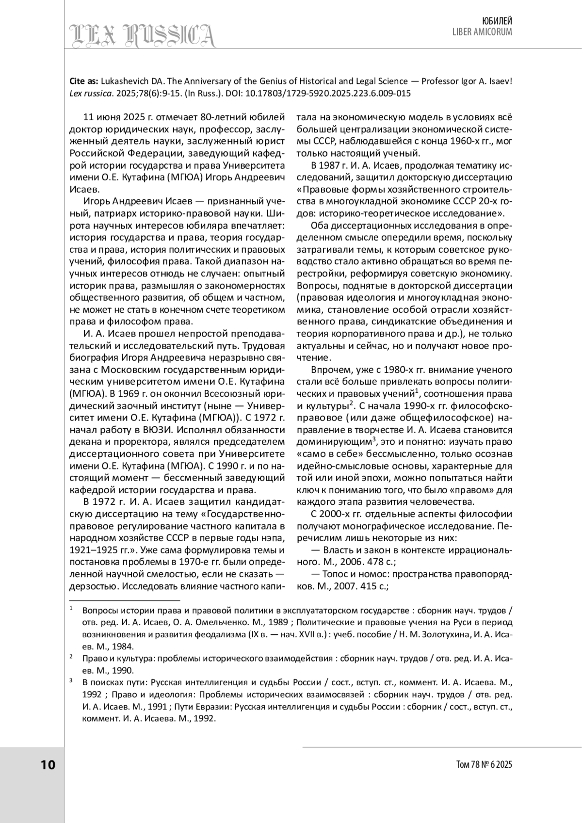 В статье анализируется творческий путь Игоря Андреевича Исаева — авторитетного ученого в области истории государства и права, философии права, теории государства и права. Предпринята попытка проследить этапы становления И. А. Исаева как исследователя, формирование и трансформацию его научных интересов, проанализированы основные идеи и выводы, которыми руководствовался юбиляр. Предложен анализ его основных трудов с указанием ключевых мыслей, повлиявших на формирование соответствующих сфер научного познания. Отмечены его идеи, ставшие основой для многих современных теорий и научных школ. Несмотря на то что И. А. Исаев прошел непростой преподавательский и профессиональный путь, его творческий пытливый ум всегда занимали сложные и важные вопросы — в области как теории права, так и теории государства, истории права и философии. Наибольший научный интерес вызывали проблемы, связанные с взаимодействием власти и государства. Вклад И. А. Исаева в науку и ее развитие неоценим, и как один из способов отдать дань уважения творчеству великого мастера подготовлена настоящая работа.