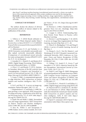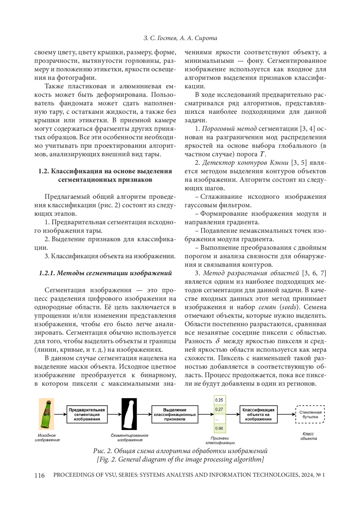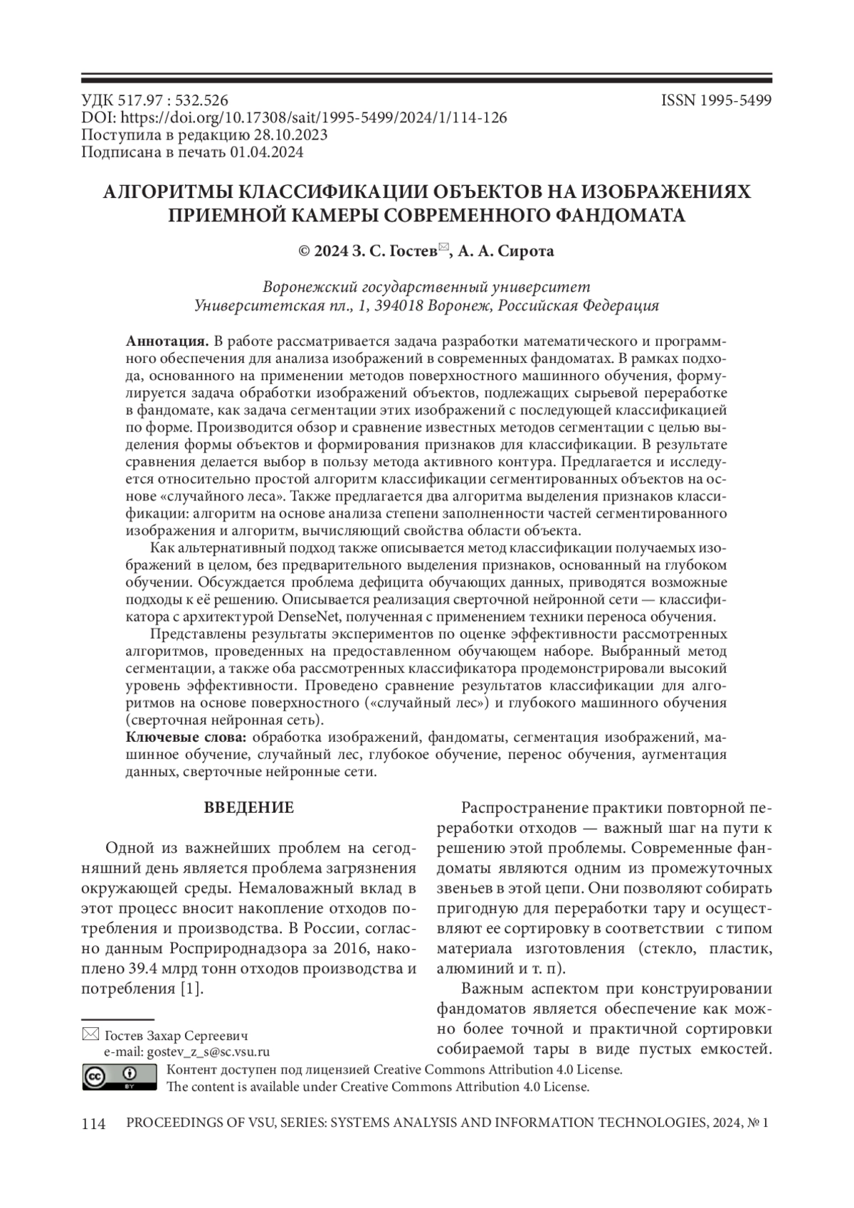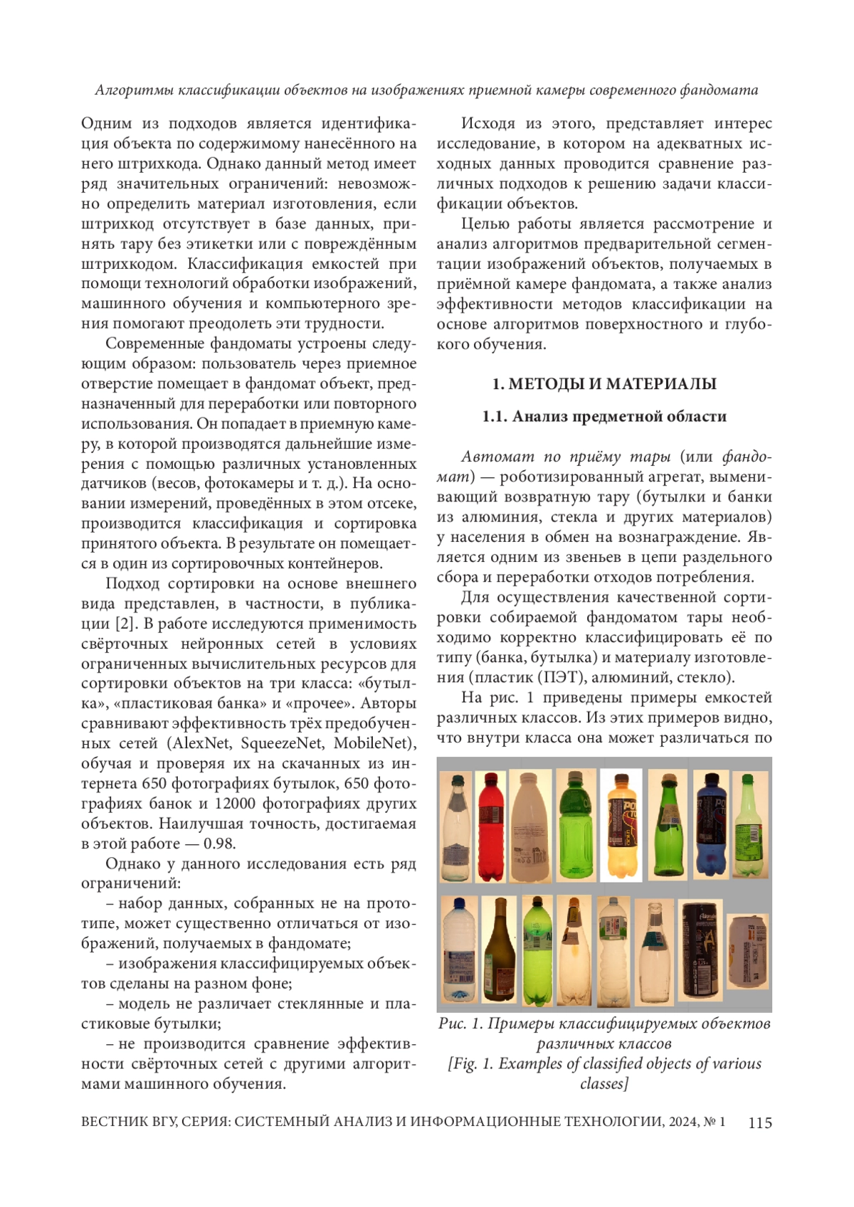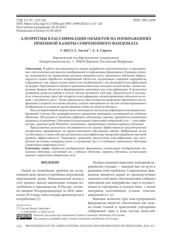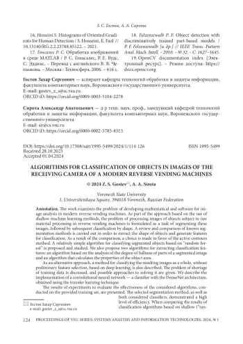 В работе рассматривается задача разработки математического и программного обеспечения для анализа изображений в современных фандоматах. В рамках подхода, основанного на применении методов поверхностного машинного обучения, формулируется задача обработки изображений объектов, подлежащих сырьевой переработке в фандомате, как задача сегментации этих изображений с последующей классификацией по форме. Производится обзор и сравнение известных методов сегментации с целью выделения формы объектов и формирования признаков для классификации. В результате сравнения делается выбор в пользу метода активного контура. Предлагается и исследуется относительно простой алгоритм классификации сегментированных объектов на основе «случайного леса». Также предлагается два алгоритма выделения признаков классификации: алгоритм на основе анализа степени заполненности частей сегментированного изображения и алгоритм, вычисляющий свойства области объекта. Как альтернативный подход также описывается метод классификации получаемых изображений в целом, без предварительного выделения признаков, основанный на глубоком обучении…