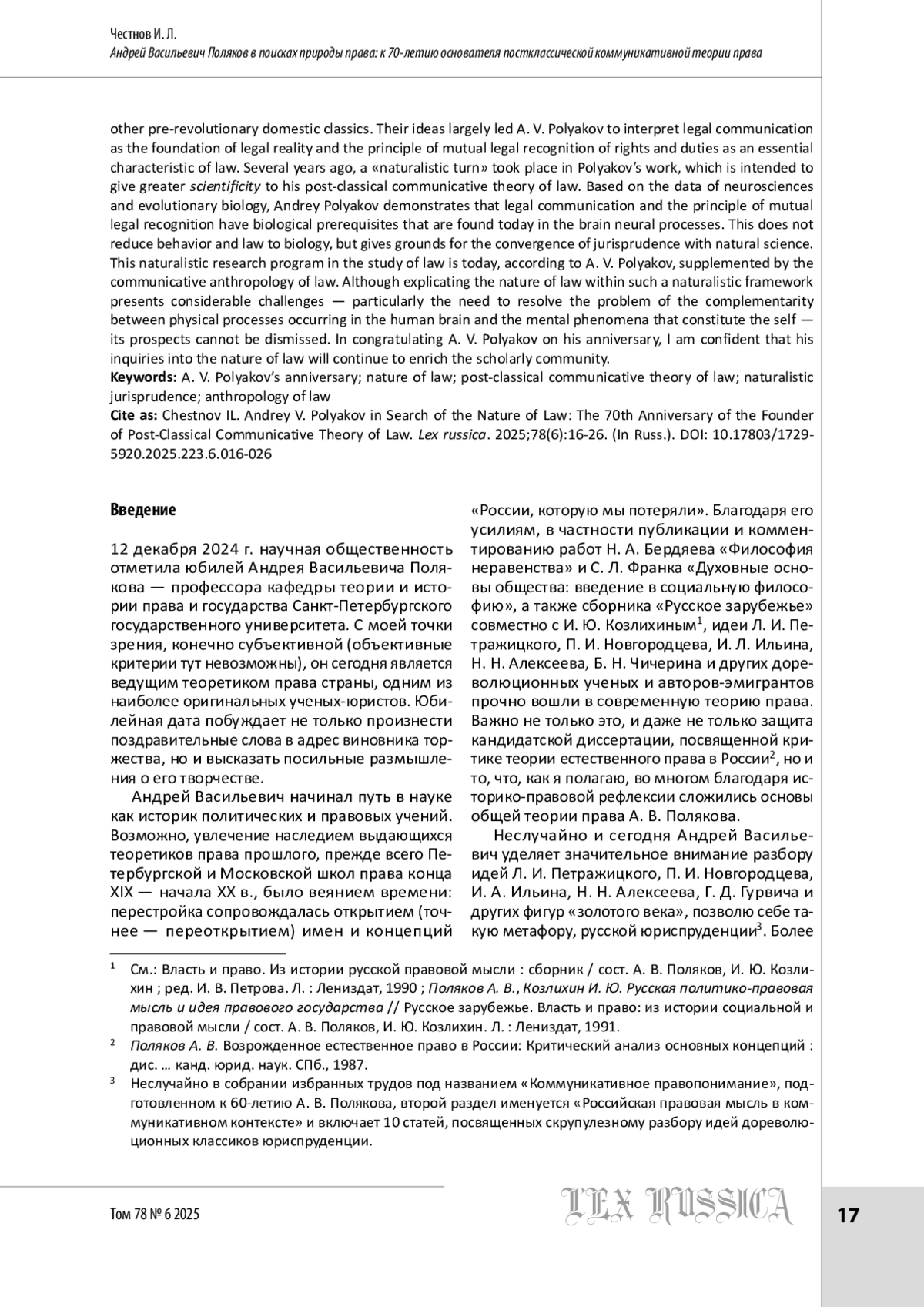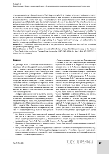 12 декабря 2024 г. исполнилось 70 лет замечательному теоретику права, автору постклассической коммуникативной теории права, профессору кафедры теории и истории права и государства Санкт- Петербургского государственного университета — Андрею Васильевичу Полякову. В статье описываются основные вехи его творческого пути. А. В. Поляков начинал как историк политических и правовых учений и заслуженно считается одним из лучших знатоков творчества Л. И. Петражицкого, В. С. Соловьева, П. И. Новгородцева и других дореволюционных отечественных классиков. Их идеи во многом вывели ученого на трактовку правовой коммуникации как основания правовой реальности, а принципа взаимного правового признания прав и обязанностей как сущностного признака права. Несколько лет назад в творчестве А. В. Полякова произошел «натуралистический поворот», который призван придать бо́льшую научность его постклассической коммуникативной теории права. Основываясь на данных нейронаук и эволюционной биологии, Андрей Васильевич демонстрирует, что правовая коммуникация и принцип взаимного правового признания имеют биологические предпосылки, которые сегодня обнаруживаются в нейронных процессах головного мозга. Это не редуцирует поведение и право к биологии, но дает основания для конвергенции юриспруденции и естествознания. Эта натуралистическая программа исследования права в настоящее время, по мысли А. В. Полякова, дополняется коммуникативной антропологией права. Несмотря на то что эксплицировать природу права с помощью такой натуралистической программы достаточно сложно: для этого надо решить проблему взаимодополнительности физических процессов, протекающих в головном мозге человека, и психических феноменов, образующих его самость, отрицать ее перспективность не приходится. Поздравляя А. В. Полякова с юбилеем, выражу уверенность, что его изыскания относительно природы права будут и дальше радовать научную общественность.