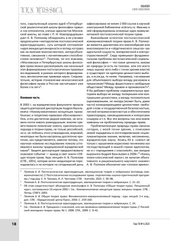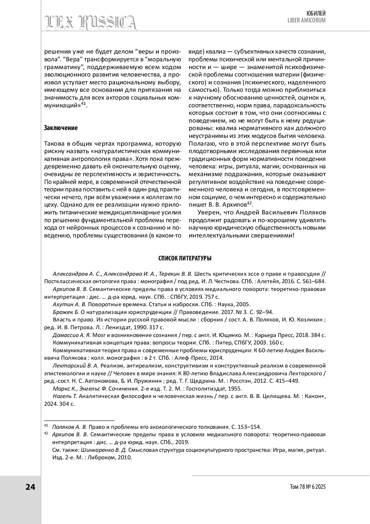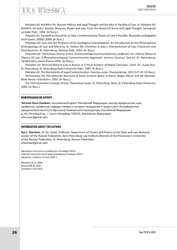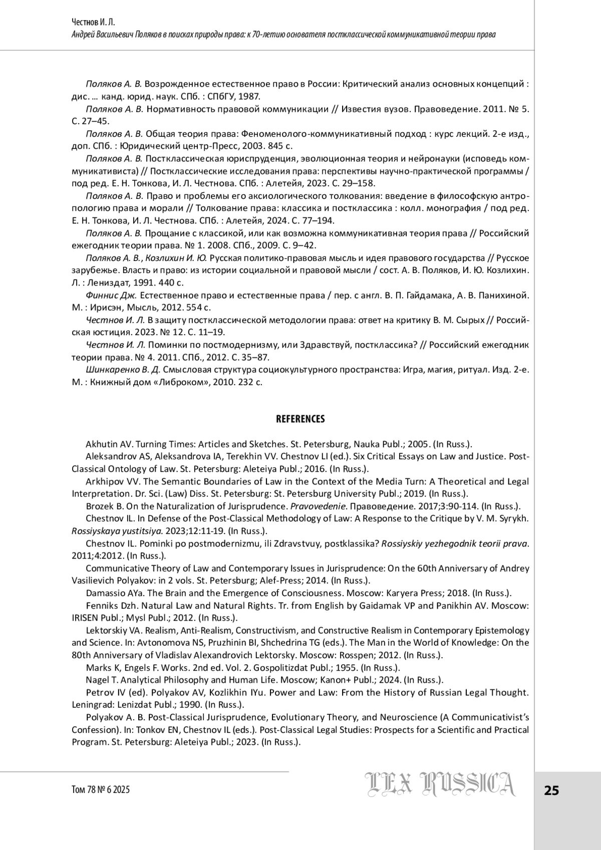 15. Поляков А. В. Постклассическая юриспруденция, эволюционная теория и нейронауки (исповедь коммуникативиста) // Постклассические исследования права: перспективы научно-практической программы / под ред. Е. Н. Тонкова, И. Л. Честнова. СПб. : Алетейя, 2023. С. 29-158.