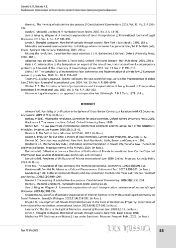 20. Deakin S. Evolution for our time: a theory of legal memetics // Current Legal Problems. 2002. Vol. 55. No. 1. P. 1-42.