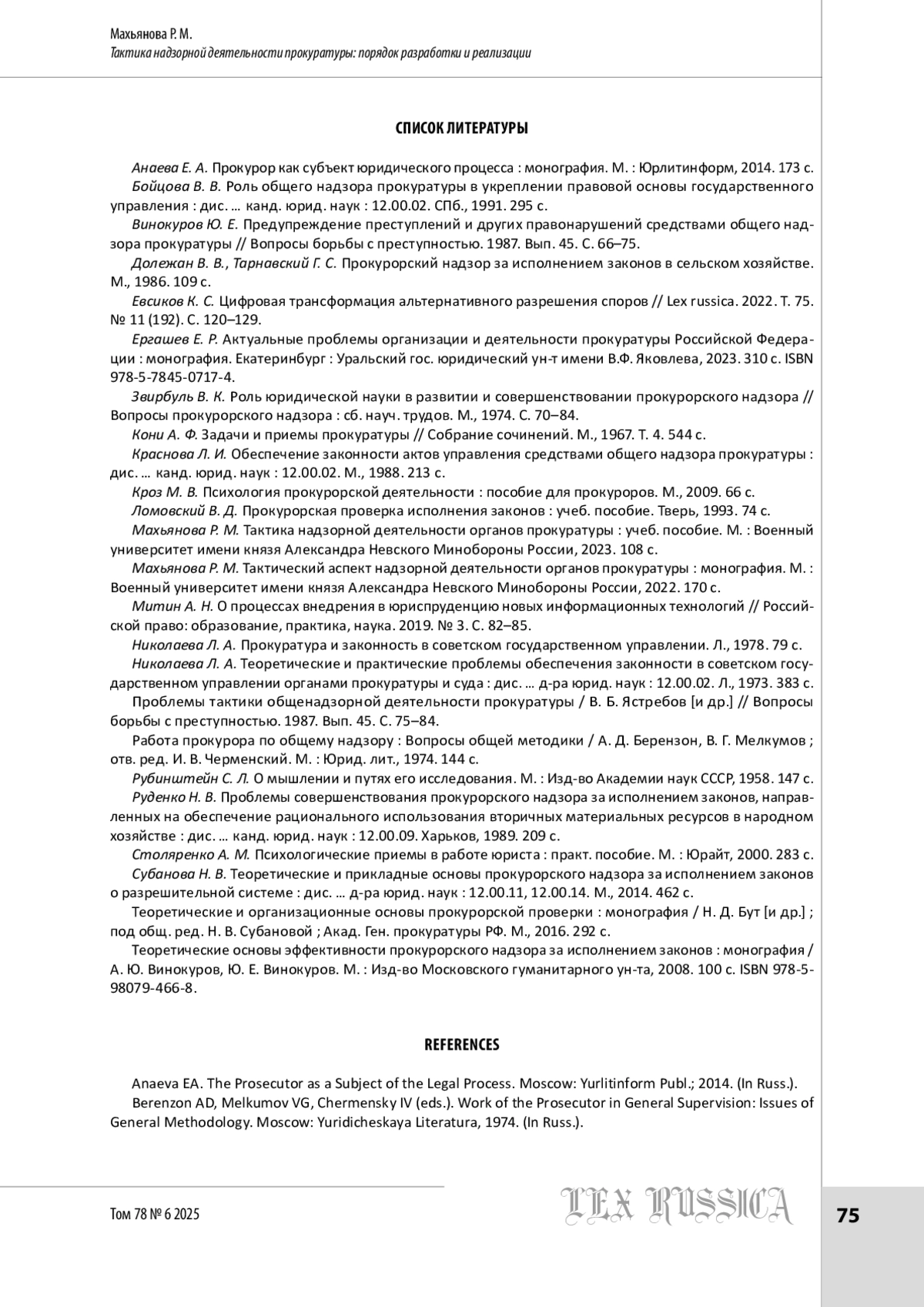 13. Махьянова Р. М. Тактический аспект надзорной деятельности органов прокуратуры : монография. М. : Военный университет имени князя Александра Невского Минобороны России, 2022. 170 с.