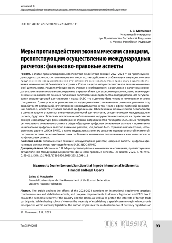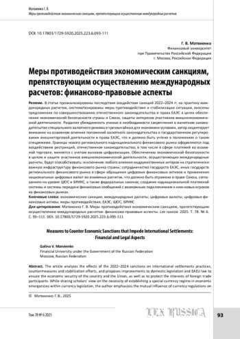 В статье проанализированы последствия воздействия санкций 2022–2024 гг. на практику международных расчетов, систематизированы меры противодействия и стабилизации ситуации, внесены предложения по совершенствованию отечественного законодательства и права ЕАЭС в целях обеспечения экономической безопасности страны и Союза, защиты интересов участников внешнеэкономической деятельности. Разделяя убежденность ученых в необходимости закрепления в валютном законодательстве специального валютного режима в чрезвычайных для экономики условиях, автор акцентирует внимание на взаимном влиянии положений валютного законодательства о государственном регулировании внешнеторговой деятельности и права ЕАЭС, что и должно быть учтено в положениях о таком спецрежиме. Границы нового регионального наднационального финансового рынка оформляются под воздействием рестрикций, отечественное законодательство, в том числе в сфере платежей во взаимной торговле, меняется с учетом вызовов цифровизации. Обеспечению экономической безопасности в целом и защите участников внешнеэкономической деятельности, осуществляющих международные расчеты, будут способствовать: исключение любого влияния недружественных акторов на стратегически важную инфраструктуру финансового рынка страны; сотрудничество государств ЕАЭС, иных государств регионального финансового рынка в сфере обращения цифровых финансовых активов и применения национальных цифровых валют во взаимных расчетах, что должно быть отражено в праве Союза, соглашениях на уровне ШОС и БРИКС, а также федеральных законах; создание наднациональной платежной системы и системы передачи финансовых сообщений с возможным подключением к ним новых игроков на финансовых рынках.