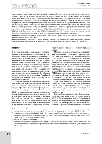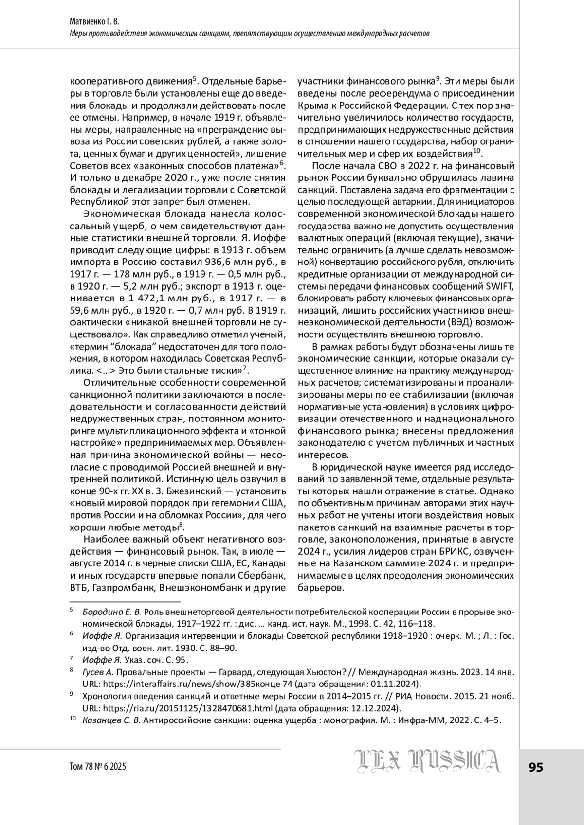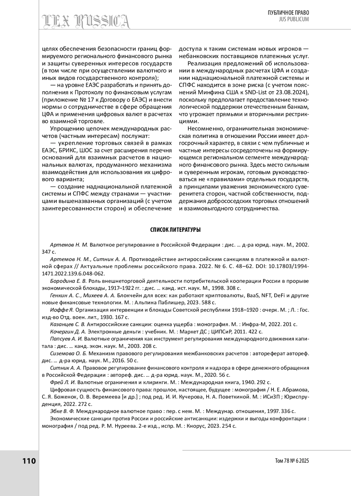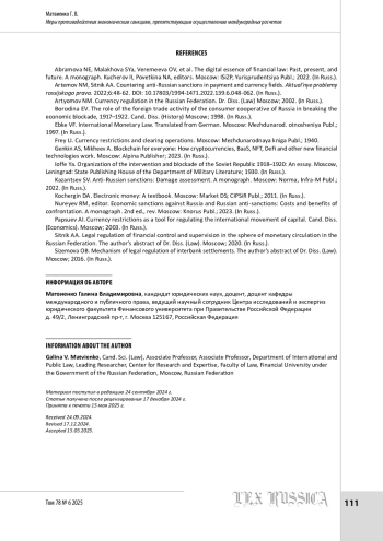2. Артемов Н. М., Ситник А. А. Противодействие антироссийским санкциям в платежной и валютной сферах // Актуальные проблемы российского права. 2022. № 6. С. 48-62. https://doi.org/10.17803/1994-1471.2022.139.6.048-062.