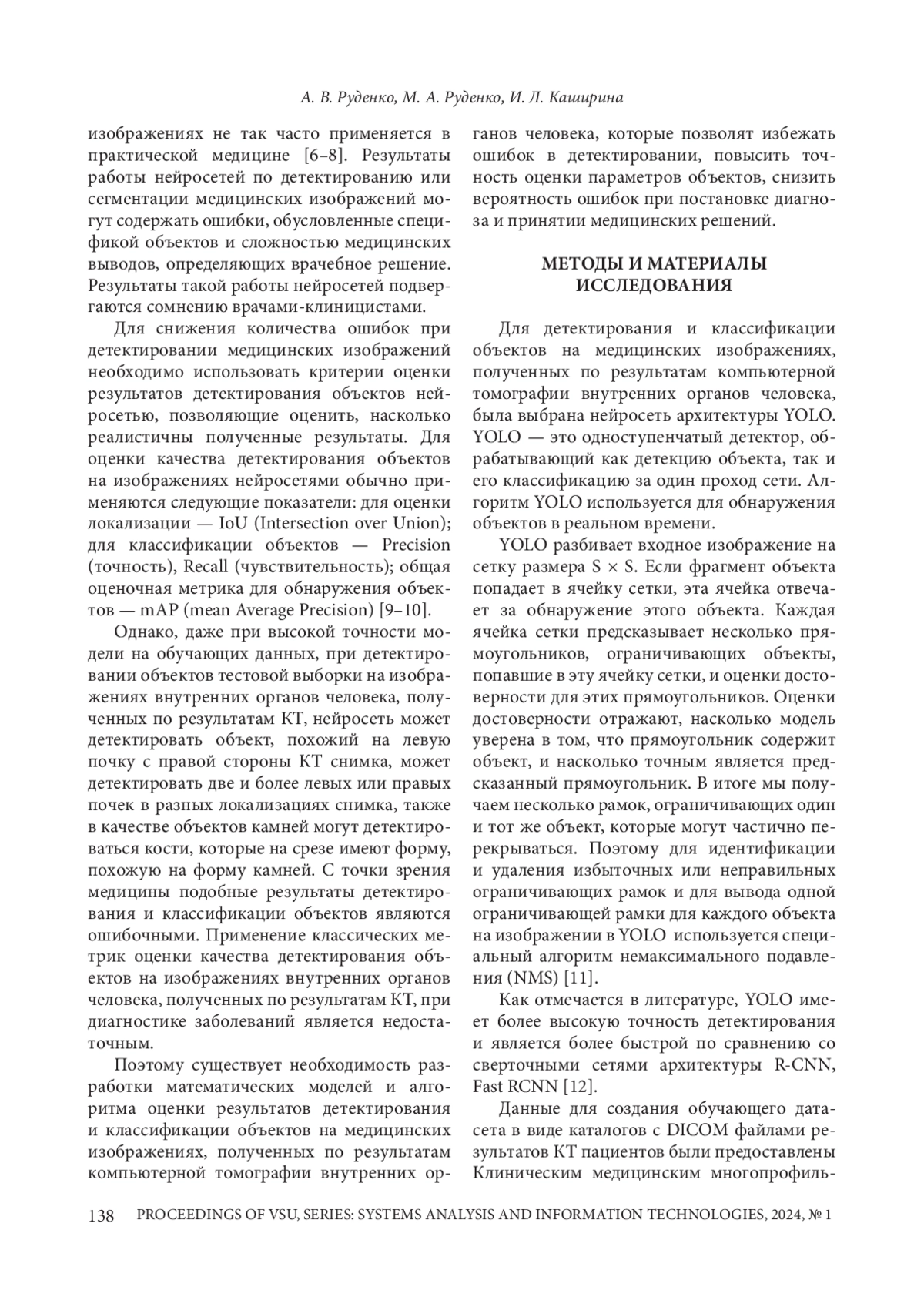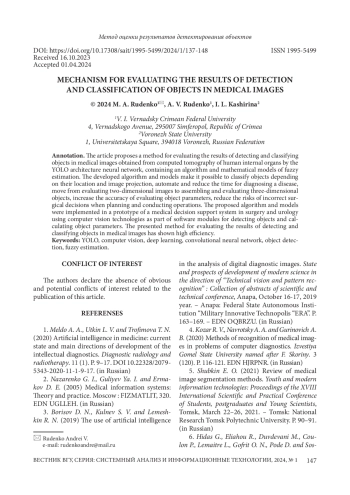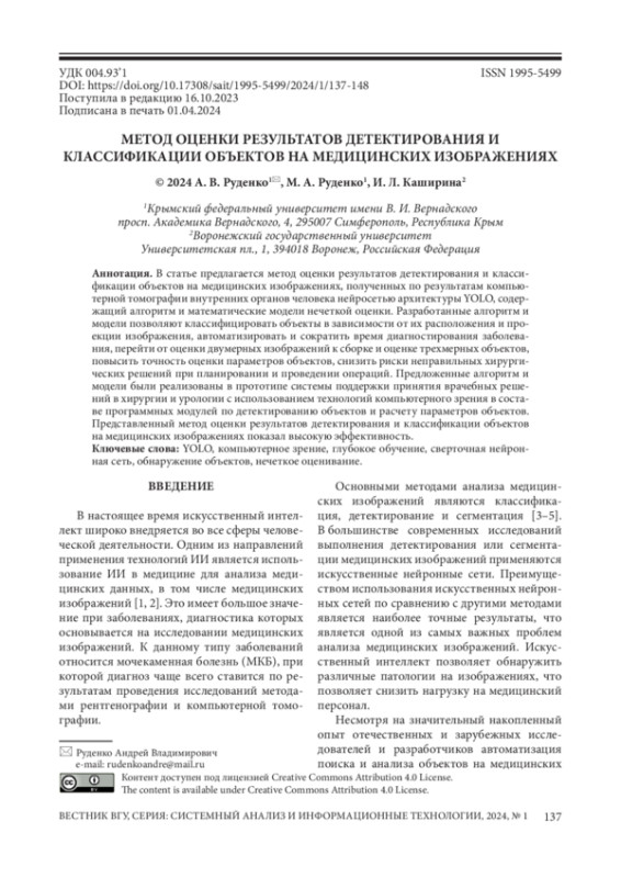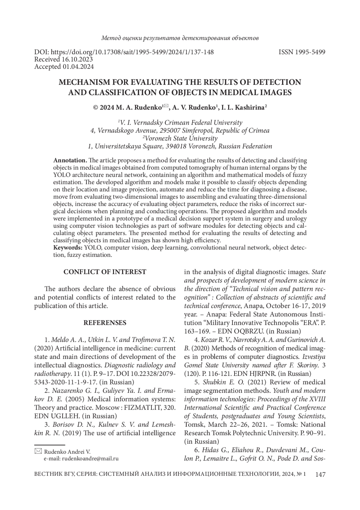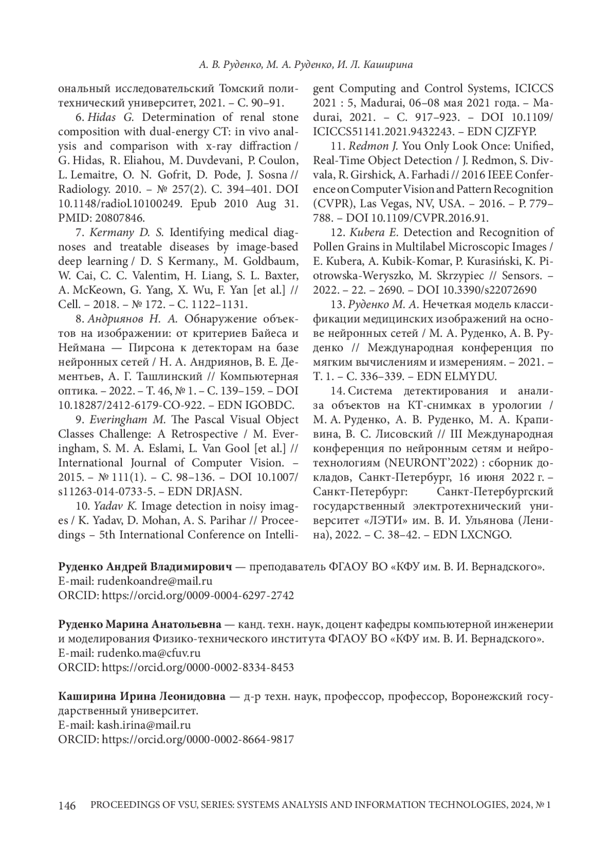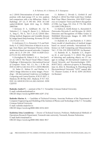 14. 	Система детектирования и анализа объектов на КТ-снимках в урологии / М. А. Руденко, А. В. Руденко, М. А. Крапивина, В. С. Лисовский // III Международная конференция по нейронным сетям и нейротехнологиям (NEURONT’2022): сборник докладов, Санкт-Петербург, 16 июня 2022 г. -Санкт-Петербург: Санкт-Петербургский государственный электротехнический университет “ЛЭТИ” им. В. И. Ульянова (Ленина), 2022. - С. 38-42. EDN: LXCNGO