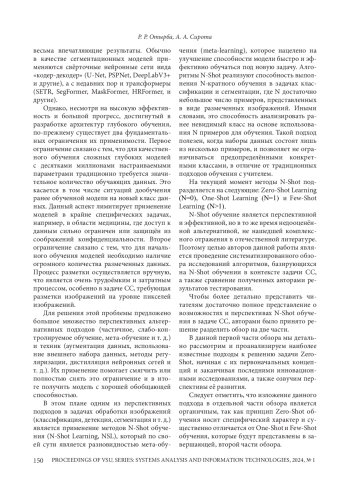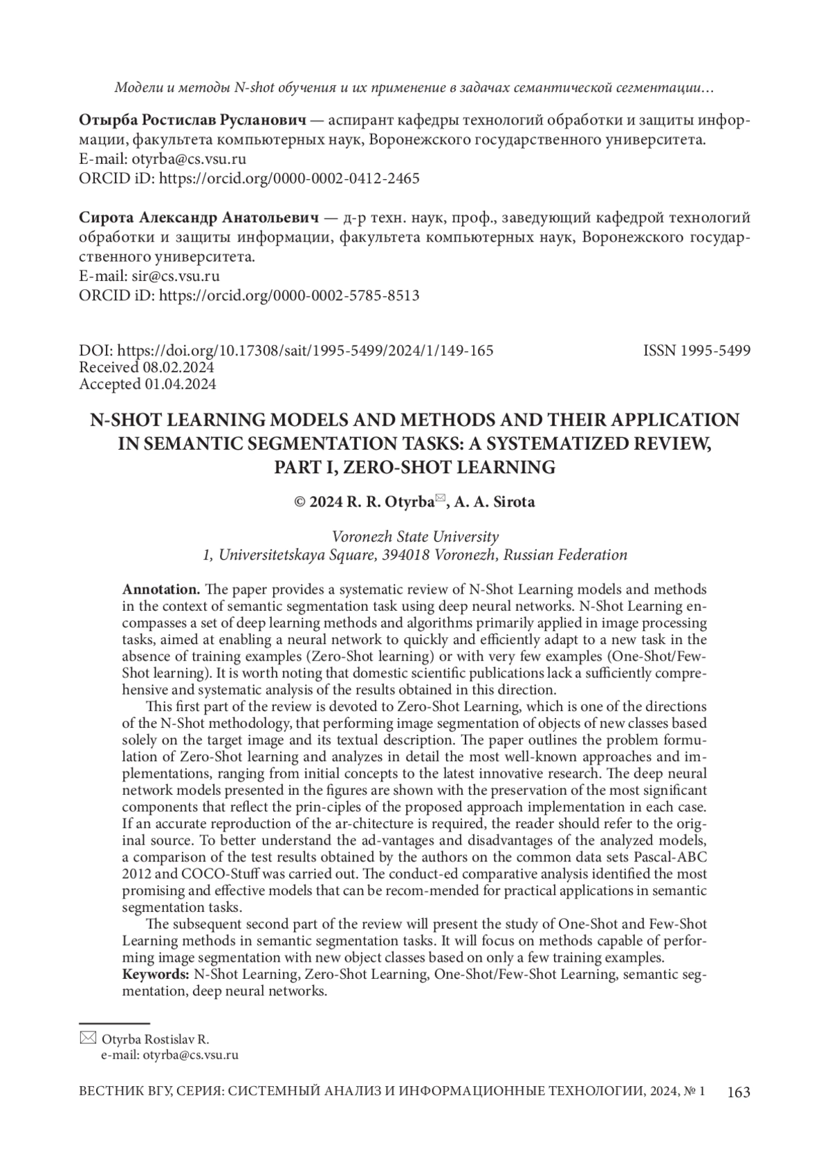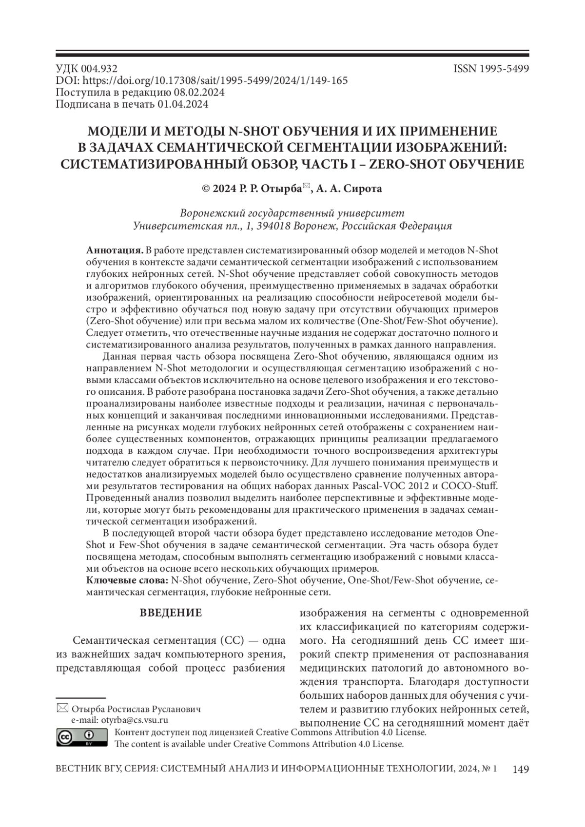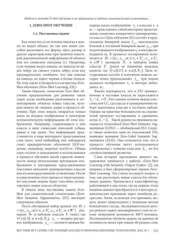 В работе представлен систематизированный обзор моделей и методов N-Shot обучения в контексте задачи семантической сегментации изображений с использованием глубоких нейронных сетей. N-Shot обучение представляет собой совокупность методов и алгоритмов глубокого обучения, преимущественно применяемых в задачах обработки изображений, ориентированных на реализацию способности нейросетевой модели быстро и эффективно обучаться под новую задачу при отсутствии обучающих примеров (Zero-Shot обучение) или при весьма малом их количестве (One-Shot/Few-Shot обучение). Следует отметить, что отечественные научные издания не содержат достаточно полного и систематизированного анализа результатов, полученных в рамках данного направления. Данная первая часть обзора посвящена Zero-Shot обучению, являющаяся одним из направлением N-Shot методологии и осуществляющая сегментацию изображений с новыми классами объектов исключительно на основе целевого изображения и его текстового описания. В работе разобрана постановка задачи Zero-Shot обучения, а также детально проанализированы наиболее известные подходы и реализации, начиная с первоначальных концепций и заканчивая последними инновационными исследованиями. Представленные на рисунках модели глубоких нейронных сетей отображены с сохранением наиболее существенных компонентов, отражающих принципы реализации предлагаемого подхода в каждом случае. При необходимости точного воспроизведения архитектуры читателю следует обратиться к первоисточнику. Для лучшего понимания преимуществ и недостатков анализируемых моделей было осуществлено сравнение полученных авторами результатов тестирования на общих наборах данных Pascal-VOC 2012 и COCO-Stuff. Проведенный анализ позволил выделить наиболее перспективные и эффективные модели, которые могут быть рекомендованы для практического применения в задачах семантической сегментации изображений. В последующей второй части обзора будет представлено исследование методов One-Shot и Few-Shot обучения в задаче семантической сегментации. Эта часть обзора будет посвящена методам, способным выполнять сегментацию изображений с новыми классами объектов на основе всего нескольких обучающих примеров.