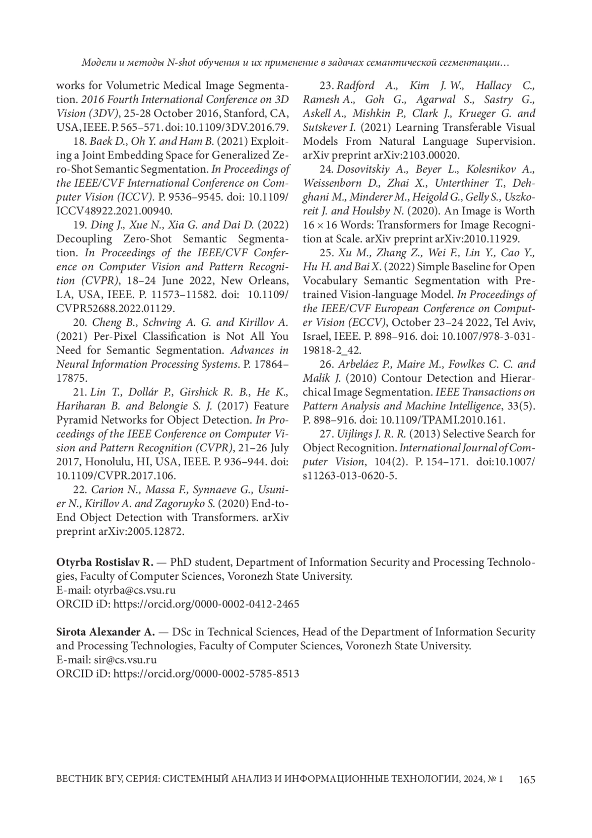 9. Zhang Y. Zero-shot Semantic Segmentation Using Relation Network / Y. Zhang, O. Khriyenko // 2021 28th Conference of Open Innovations Association (FRUCT), Moscow, Russia, 27-29 January 2021. - P. 516-527. - 10.23919/ FRUCT50888.2021.9347619. DOI: 10.23919/FRUCT50888.2021.9347619
