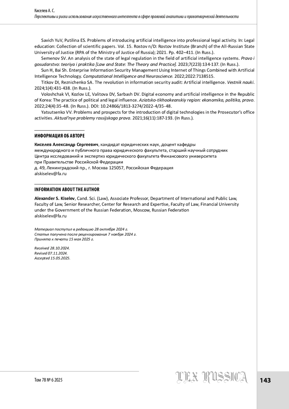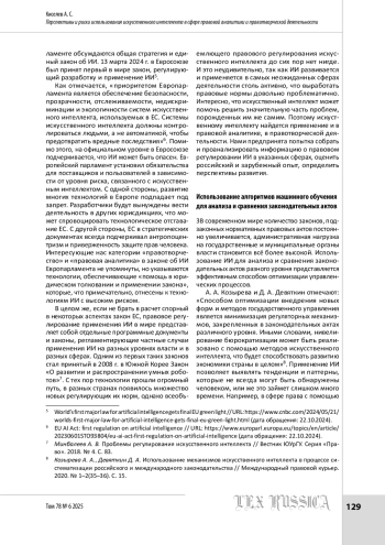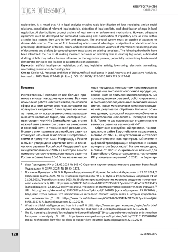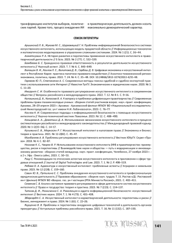 18. Эбергардт С. А. Искусственный интеллект в нормотворческой деятельности: перспективы и риски // Бизнес, менеджмент и право. 2024. № 1 (61). С. 22-26.