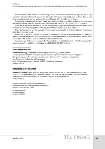 9. Козырева А. А., Девяткин Д. А. Использование механизмов искусственного интеллекта в процессе систематизации российского и международного законодательства // Международный правовой курьер. 2020. № 1-2(35-36). С. 14-17.