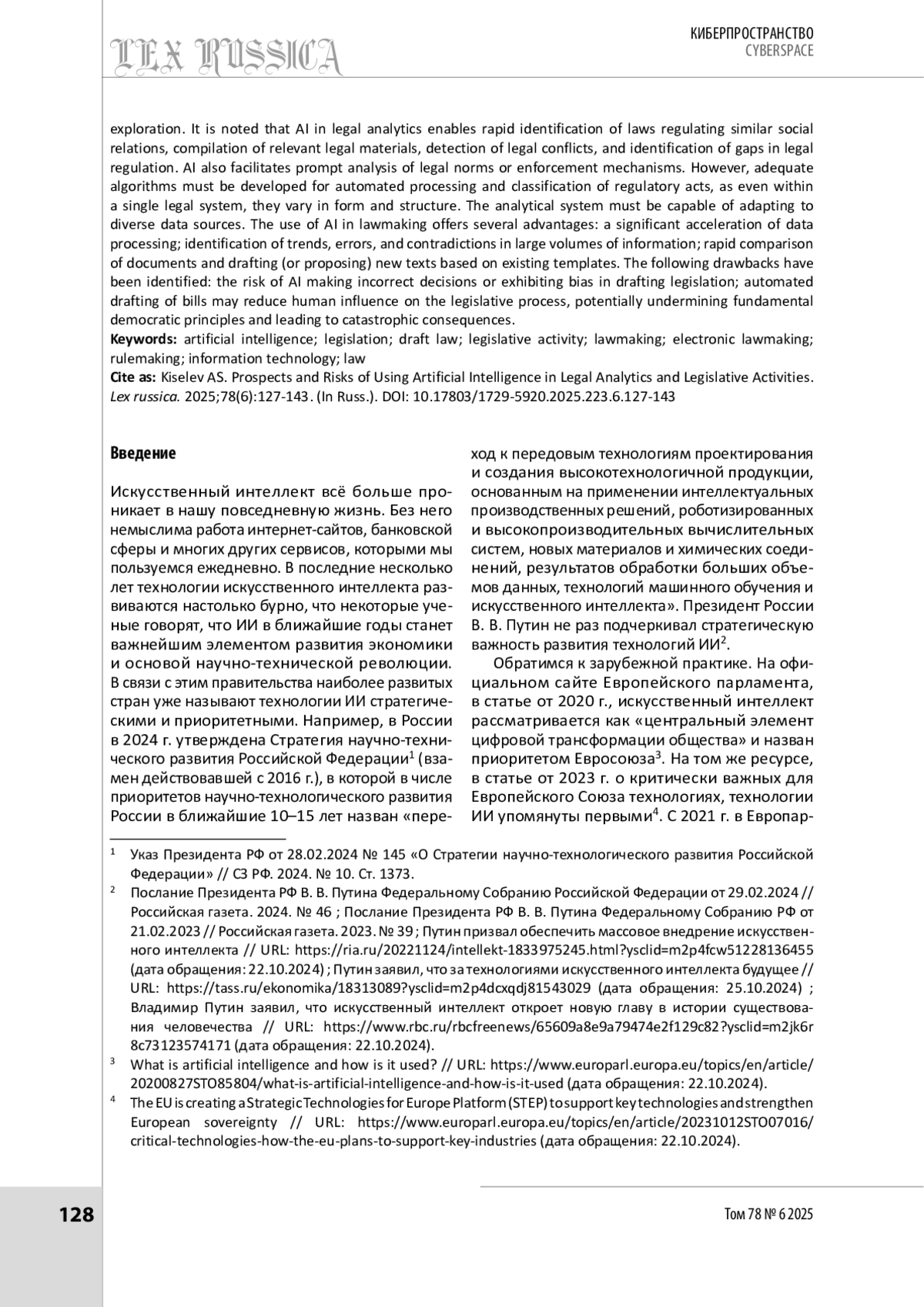 16. Семенов С. В. Анализ состояния правового регулирования в сфере деятельности систем искусственного интеллекта // Право и государство: теория и практика. 2023. № 7 (223). С. 134-137.