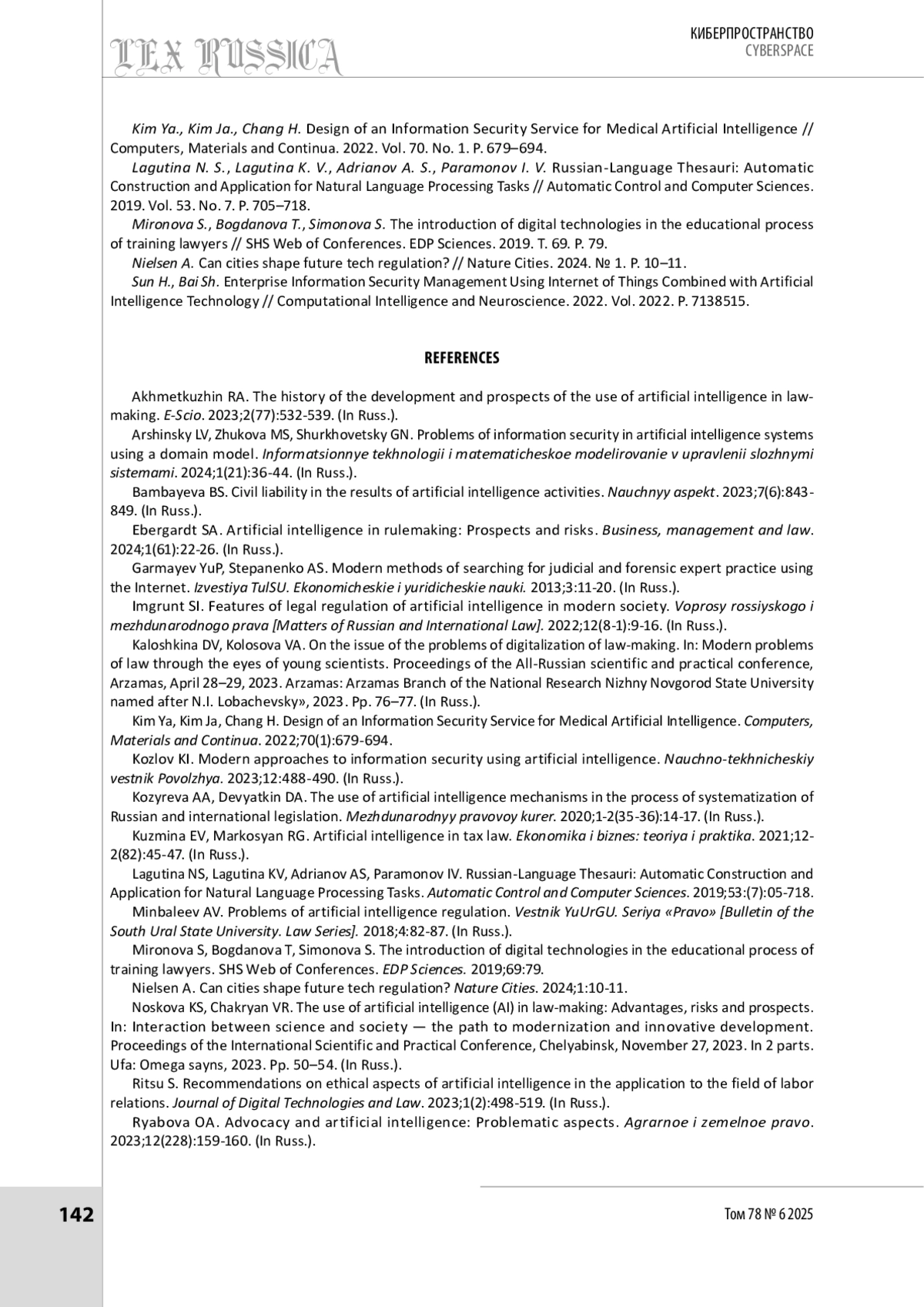 2. Ахметкужин Р. А. История развития и перспективы применения искусственного интеллекта в правотворческой деятельности // E-Scio. 2023. № 2 (77). С. 532-539.