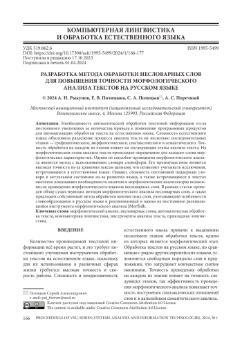 Необходимость автоматической обработки текстовой информации из-за постоянного увеличения ее количества привела к появлению программных продуктов для автоматизации обработки текста на естественном языке. Сложность естественного языка обусловила разделение процесса анализа текста на несколько последовательных этапов - графематического, морфологического, синтаксического и семантического. Точность обработки на каждом из этапов влияет на последующие этапы анализа текста. На морфологическом этапе анализа текста происходит определение для каждого слова морфологических характеристик. Одним из способов проведения морфологического анализа является метод с использованием словаря словоформ. Его преимуществом является высокая точность из-за хранения лексем целиком, что позволяет учитывать исключения, встречающиеся в естественном языке. Однако, сложность постоянной поддержки словаря в актуальном состоянии из-за развития языка, а также встречающиеся в текстах опечатки показывают необходимость наличия в морфологических анализаторах возможности проведения морфологического анализа несловарных слов. В рамках статьи проведен обзор существующих методов морфологического анализа несловарных слов, а также предложен собственный метод обработки неизвестных слов, учитывающий особенности словообразования в русском языке и реализованный в одном из постоянное развивающийся инструмента морфологического анализа JMorfSdk.
