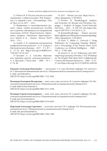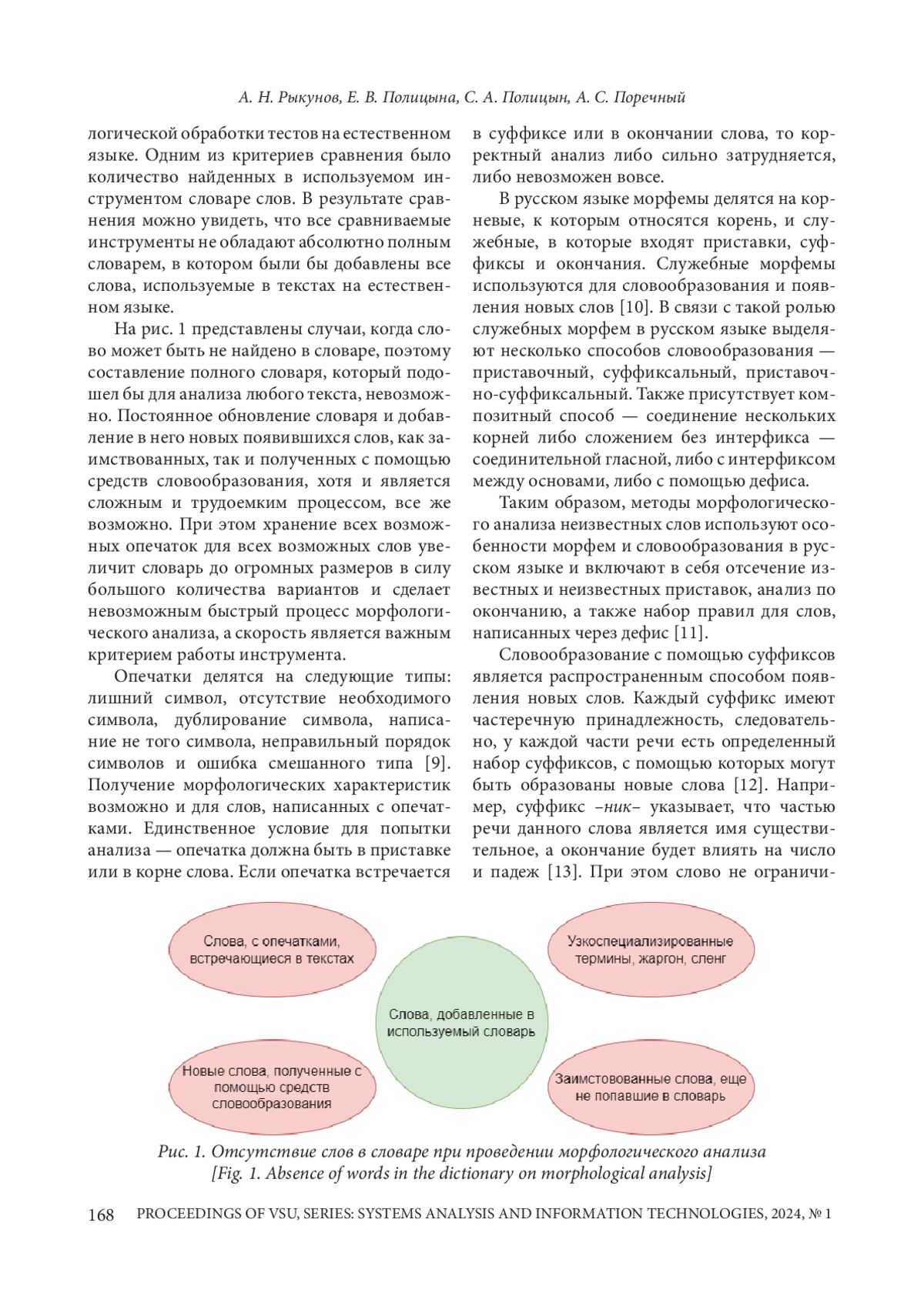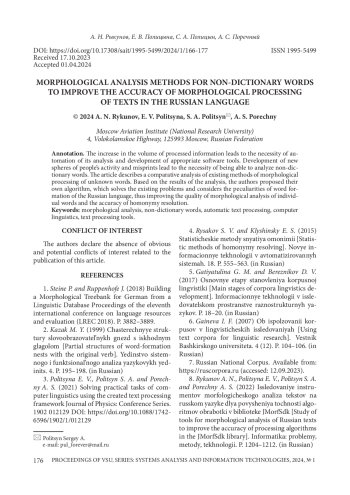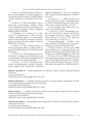 8. 	Рыкунов А. Н. Исследование инструментов морфологического анализа текстов на русском языке для повышения точности алгоритмов обработки в библиотеке JMorfSdk / А. Н. Рыкунов, E. В. Полицына, С. А. Поли-цын, А. С. Поречный // Информатика: проблемы, методы, технологии. - 2022. - С. 12041212. EDN: QKISHK
