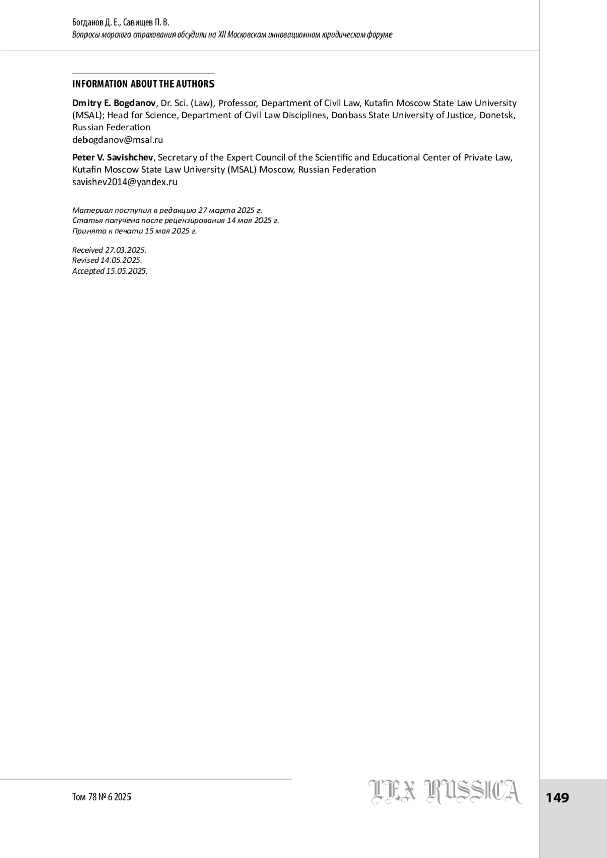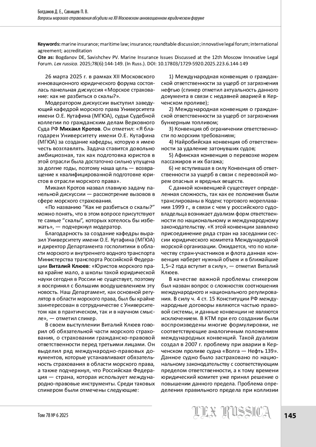 В статье дан обзор панельной дискуссии «Морское страхование: как не разбиться о скалы?», прошедшей 26 марта 2025 г. Модератором дискуссии выступил заведующий кафедрой морского права Университета имени О. Е. Кутафина (МГЮА) Михаил Кротов. В рамках панельной дискуссии обсуждались важные и острые вопросы в области морского страхования и морского права в целом. В дискуссии приняли участие представители профессионального юридического сообщества, заинтересованные в развитии отношений в области морского права. Спикеры анализировали особенности национального регулирования, международные акты, обсуждали способы и средства преодоления выявленных несовершенств и оптимальные модели правового регулирования. Была создана необходимая площадка для конструктивного и продуктивного диалога, результаты которого могут быть положены в основу дорожной карты по реформированию специального регулирования.