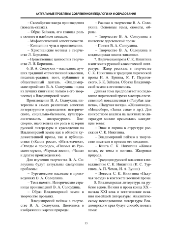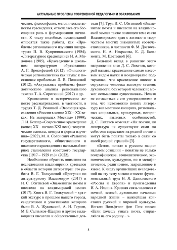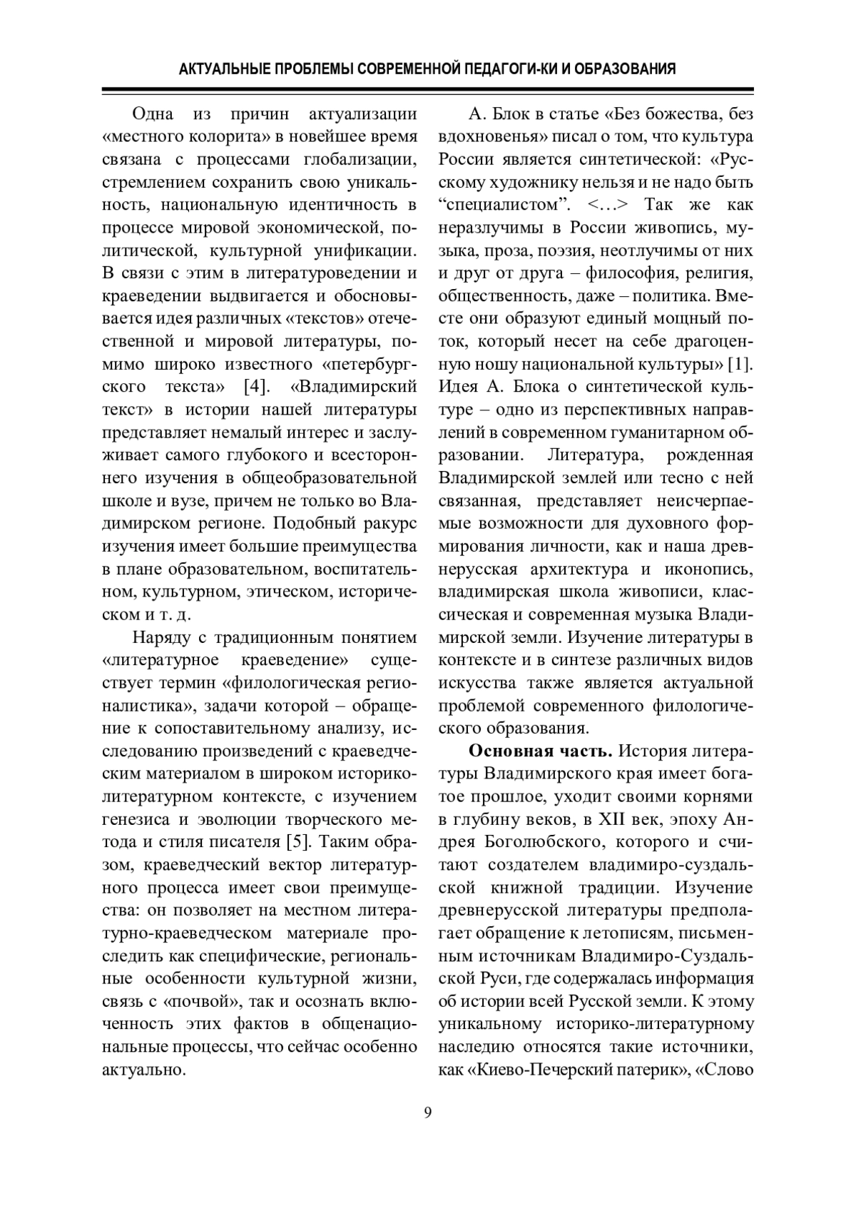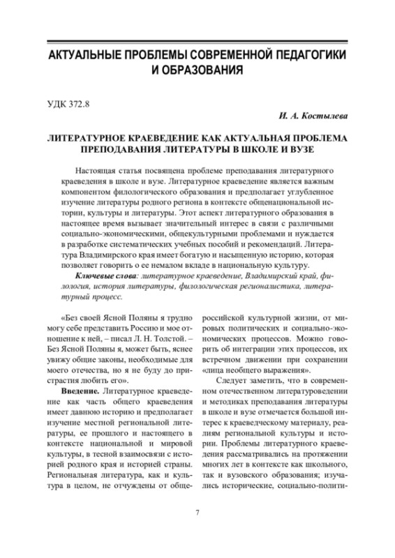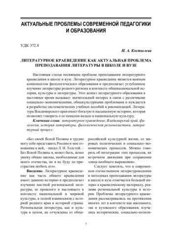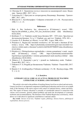 Настоящая статья посвящена проблеме преподавания литературного краеведения в школе и вузе. Литературное краеведение является важным компонентом филологического образования и предполагает углубленное изучение литературы родного региона в контексте общенациональной истории, культуры и литературы. Этот аспект литературного образования в настоящее время вызывает значительный интерес в связи с различными социально-экономическими, общекультурными проблемами и нуждается в разработке систематических учебных пособий и рекомендаций. Литература Владимирского края имеет богатую и насыщенную историю, которая позволяет говорить о ее немалом вкладе в национальную культуру.