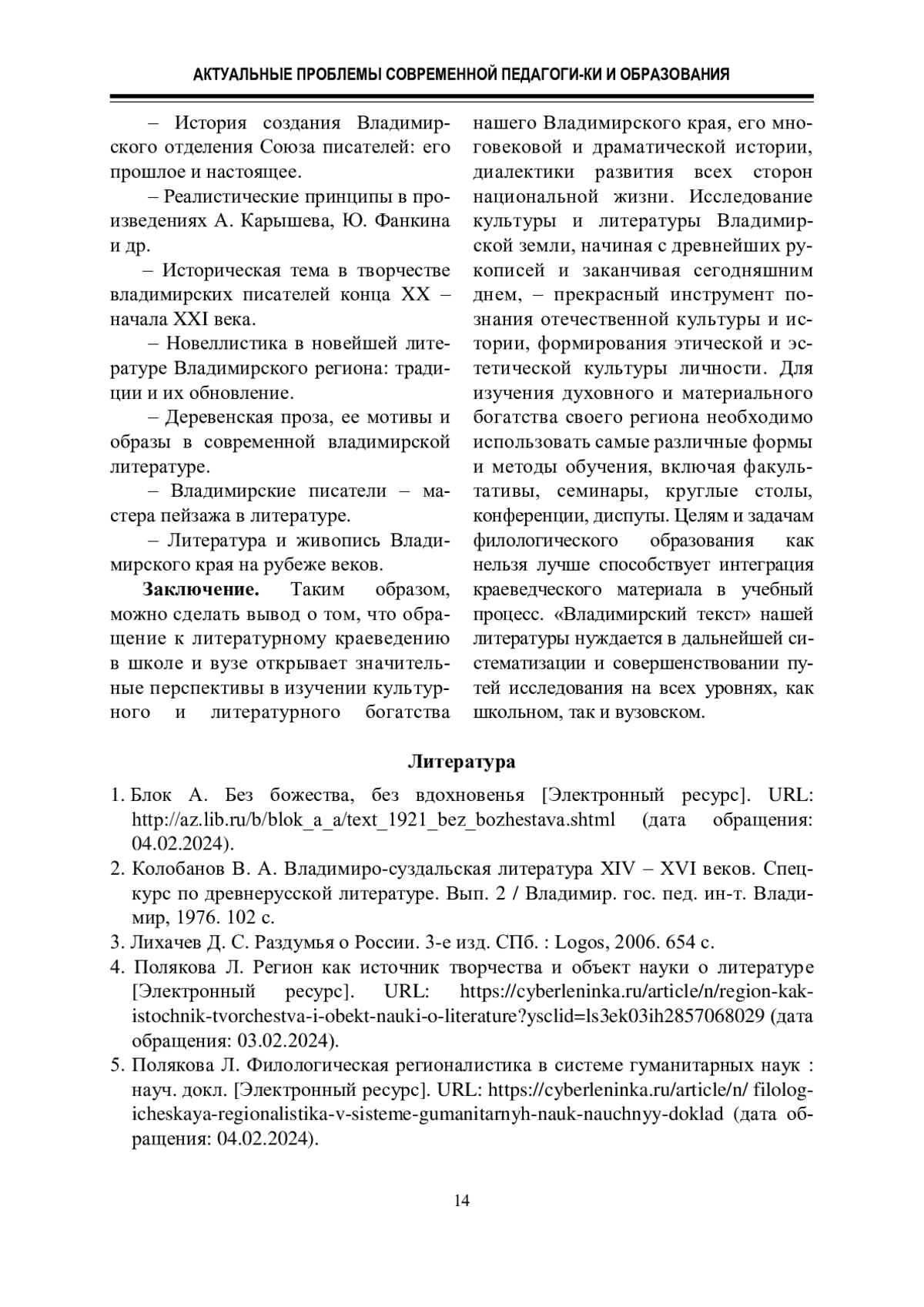 4. Полякова Л. Регион как источник творчества и объект науки о литературе [Электронный ресурс]. URL: https://cyberleninka.ru/article/n/region-kak-istochnik-tvorchestva-i-obekt-nauki-o-literature?ysclid=ls3ek03ih2857068029 (дата обращения: 03.02.2024).