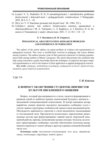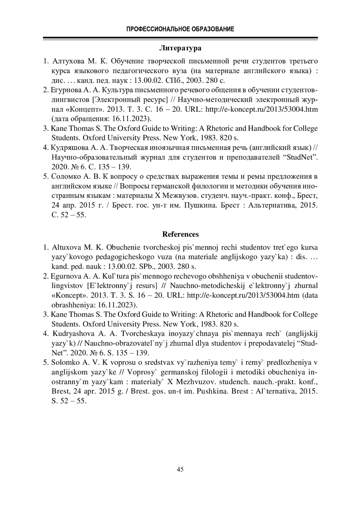 2. Егурнова А. А. Культура письменного речевого общения в обучении студентовлингвистов [Электронный ресурс] // Научно-методический электронный журнал «Концепт». 2013. Т. 3. С. 16 - 20. URL: http://e-koncept.ru/2013/53004.htm (дата обращения: 16.11.2023).