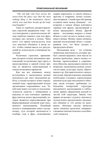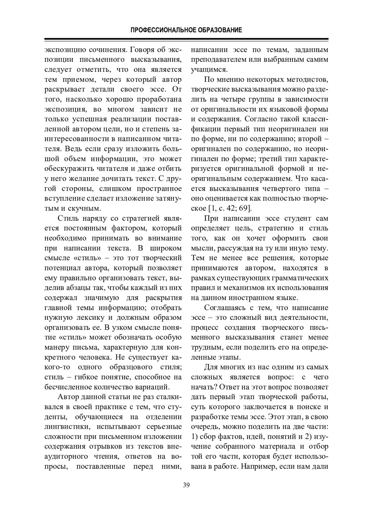 Вопрос, который рассматривается в статье, касается формирования и развития одной из наиболее важных компетенций будущего лингвиста – письменной коммуникативной компетенции. В центре внимания автора выработка умения грамотно выстроить письменное сообщение (эссе) с учетом знания структурных особенностей данного вида письменной речи. Обсуждается зависимость стратегии и стиля письменного высказывания от поставленной цели. Предлагается использовать определенные рациональные методы при формулировании главной мысли творческой письменной работы; приемы, позволяющие вызвать интерес читателя, на которого ориентировано сообщение; способы обеспечения логически выдержанного перехода от одного абзаца к другому в рамках основной (базовой) части эссе.