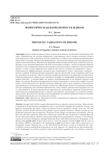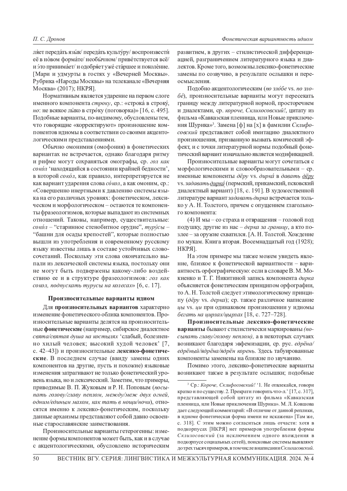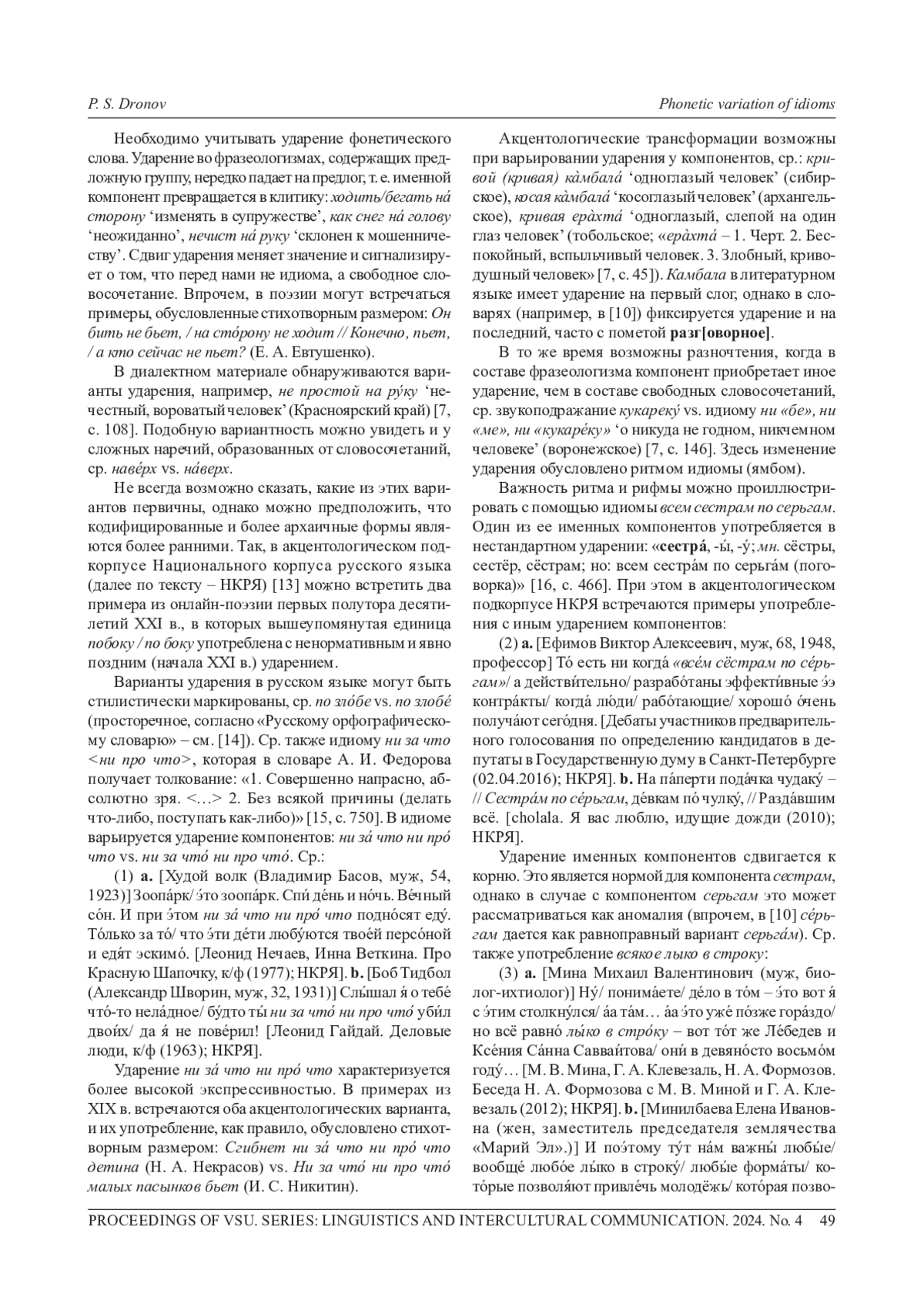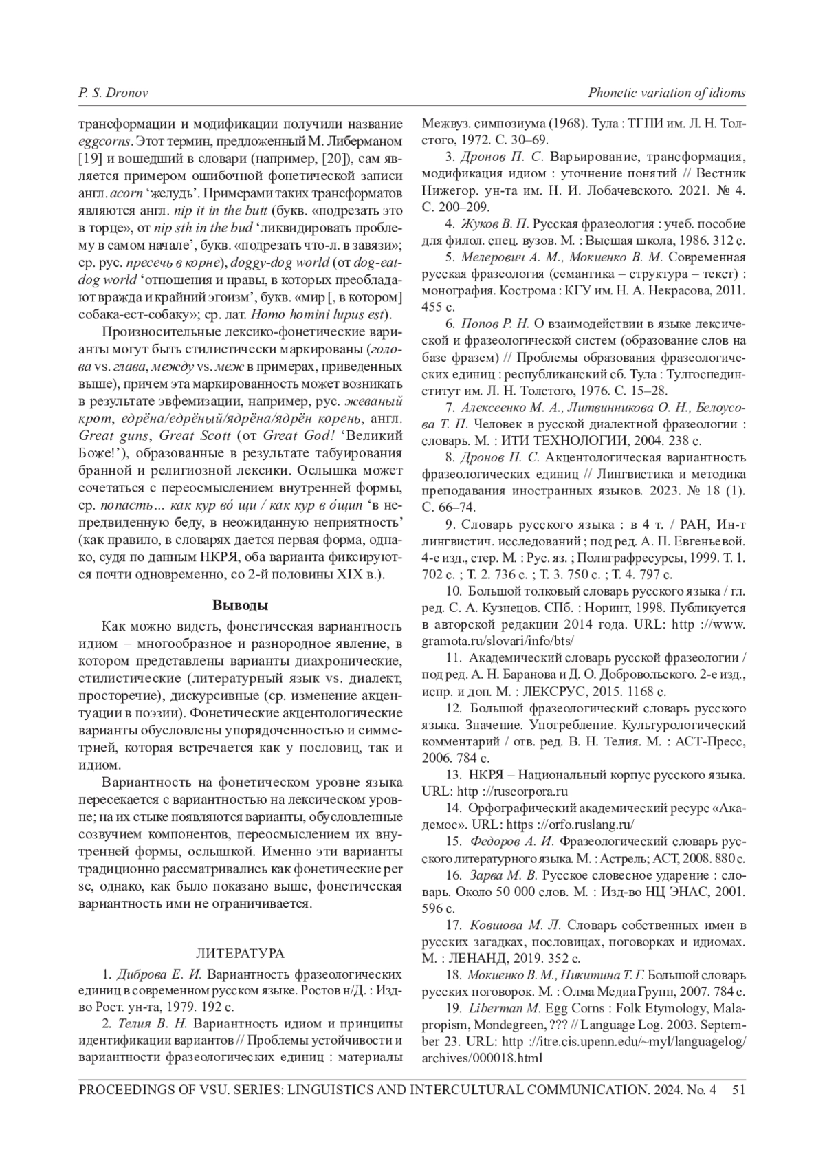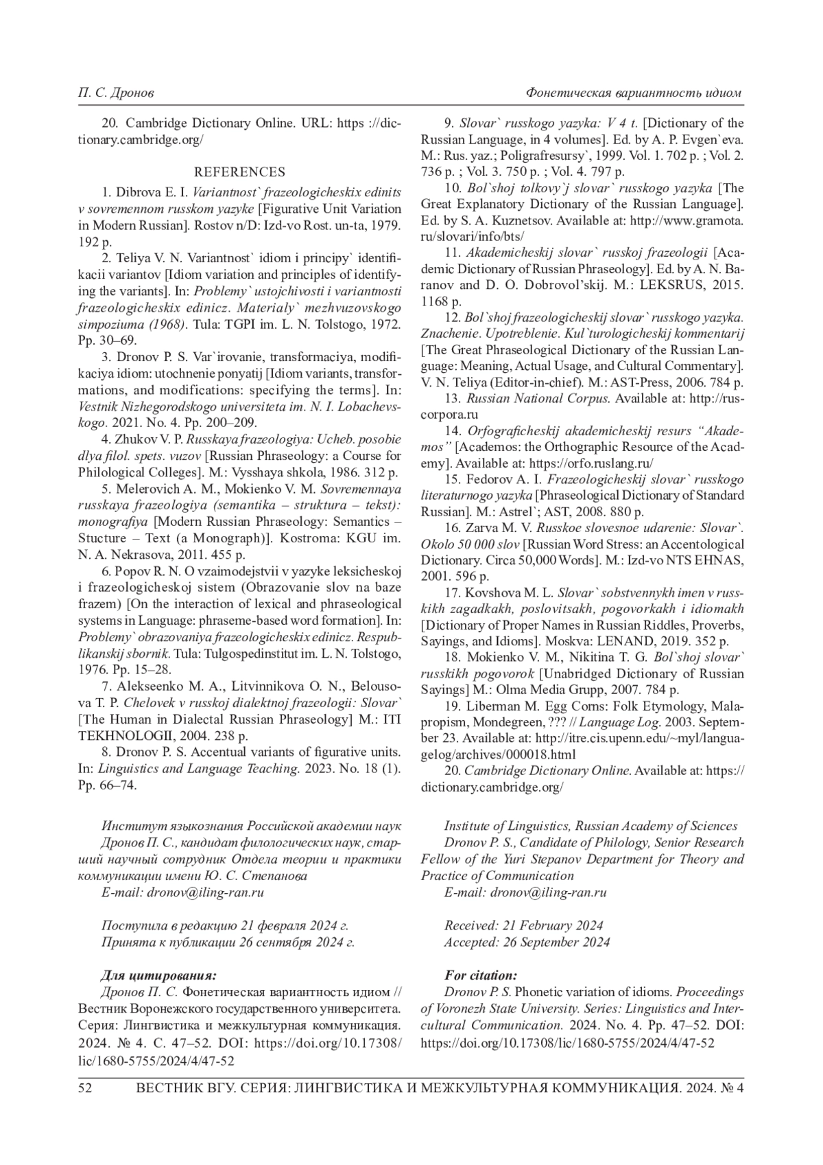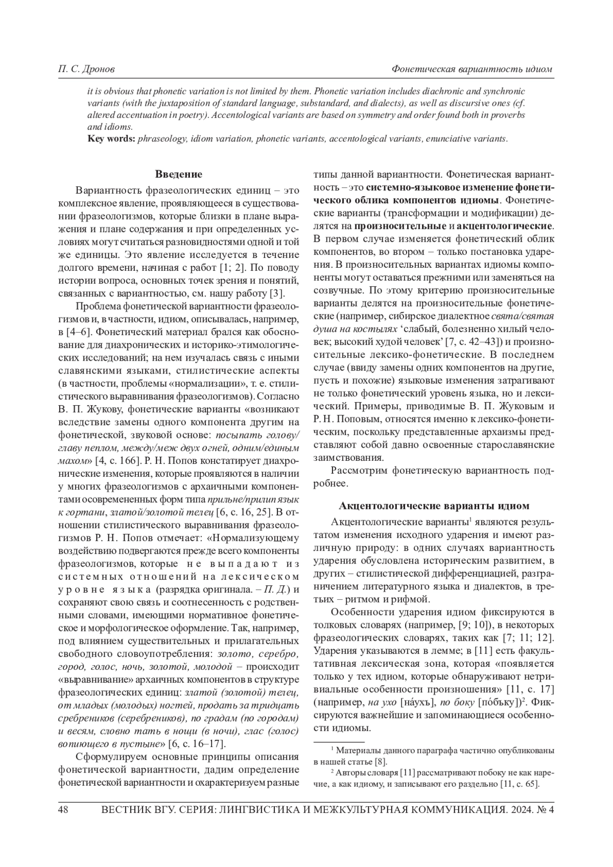 8. 	Дронов П. С. Акцентологическая вариантность фразеологических единиц // Лингвистика и методика преподавания иностранных языков. 2023. № 18 (1). С. 66-74. EDN: NUBXQU