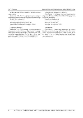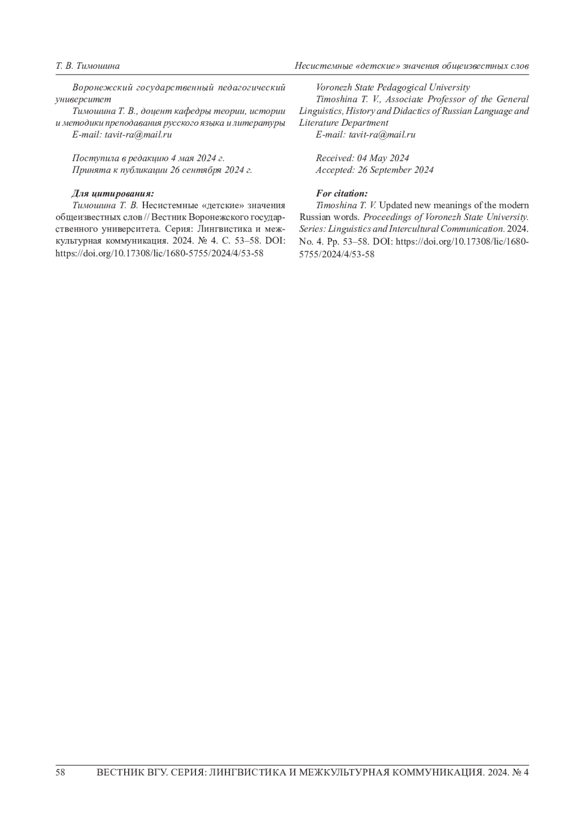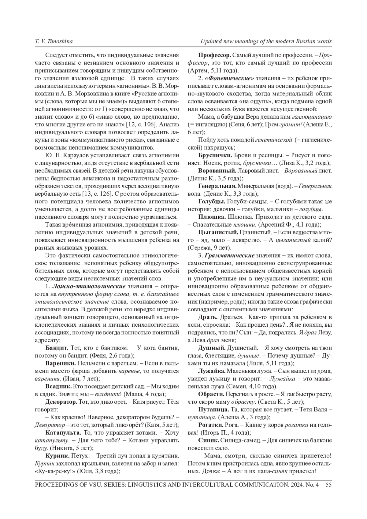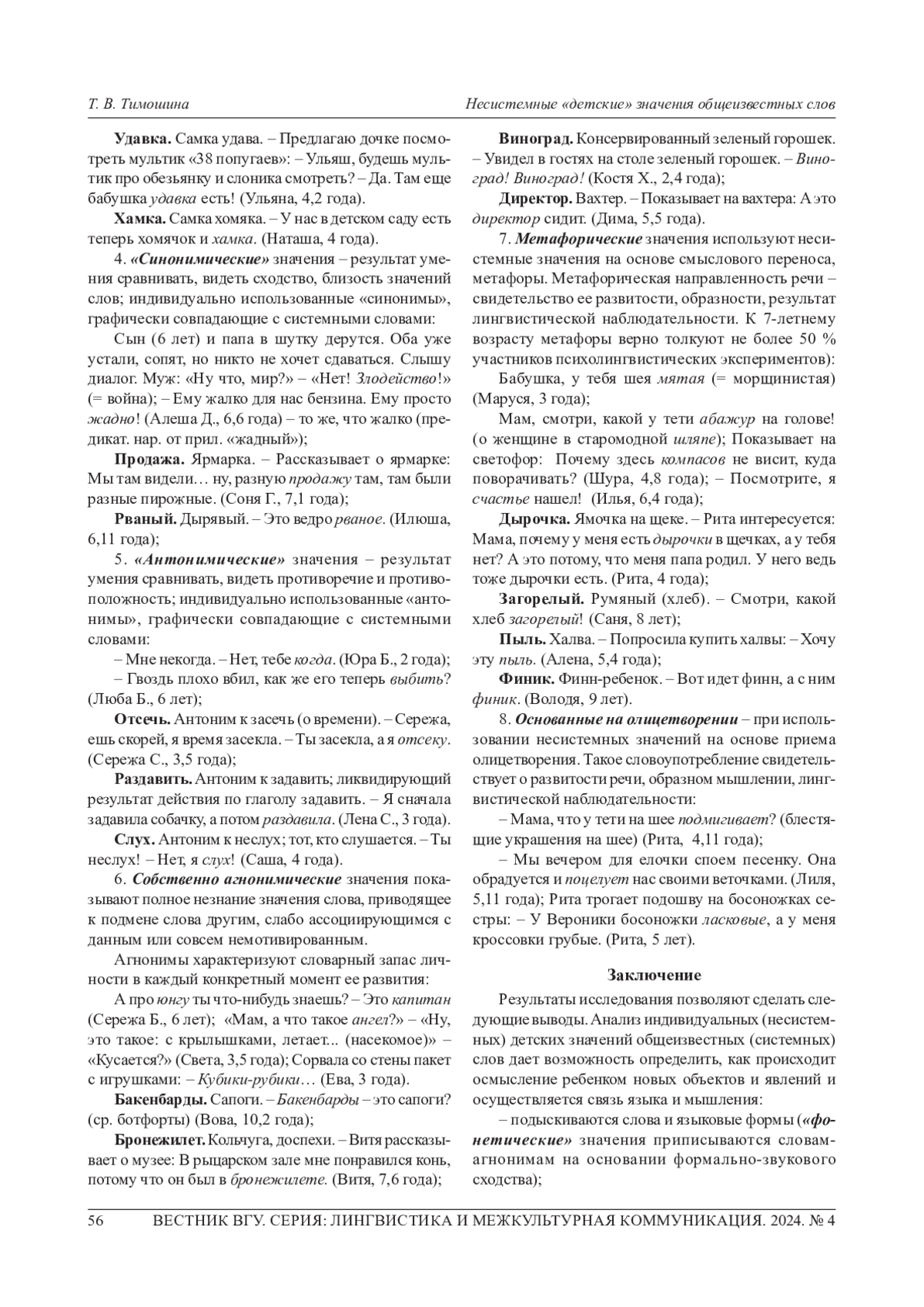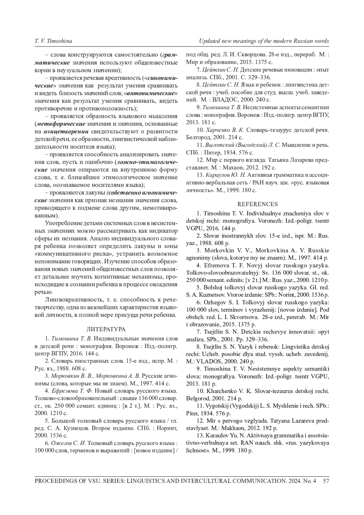 1. 	Тимошина Т. В. Индивидуальные значения слов в детской речи: монография. Воронеж: Изд.-полигр. центр ВГПУ, 2016. 144 с.