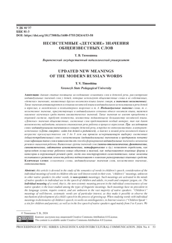 Данная статья посвящена исследованию семантики слов в детской речи, рассмотрению индивидуальных значений слов у детей, которые используют общеизвестные слова в их собственных, «детских» значениях, неизвестных другим носителям языка (иначе говоря, в значениях несистемных). Такие значения активизируются в сознании носителей языка в индивидуальном использовании в речи детей и взрослых, в молодежном и компьютерном жаргонах и т. д. Индивидуальное значение слова, т. е. несистемное значение, присутствующее в индивидуальном сознании одного носителя языка, является наименее изученным среди типов лингвистических значений. Такие значения не имеют прецедента в языковой системе, требуют контекста, неизвестны подавляющему большинству носителей языка. «Детские» значения общеизвестных, системных слов представляют особый интерес, так как дают возможность наблюдать механизм становления речи ребенка в процессе взросления. При исследовании слов с индивидуальными значениями в словарях детской речи, в трудах по онтолингвистике, в интернет-источниках («Дети говорят»: сайт для детей и родителей), а также в живой речи носителей языка в возрасте преимущественно от 3 до 8 лет мы провели исчерпывающую выборку системных (общеупотребительных) слов с несистемными (индивидуальными) значениями и предприняли попытку классификации таких слов в зависимости от способа формирования индивидуальных значений и механизма речевого мышления ребенка. Выявленные группы значений слов (ложно-этимологические, фонетические, синонимические, собственно агнонимические, метафорические и др.) позволяют определить, как происходит осмысление ребенком новых объектов и явлений, как подыскиваются языковые формы и категории в окружающей речевой среде, когда они конструируются самостоятельно, какие моменты когнитивного развития личности ребенка подталкивают к освоению разноуровневых языковых средств.
