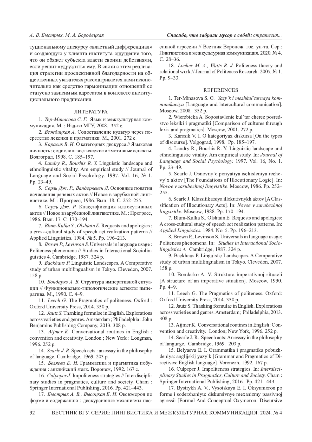 15. 	Culpeper J. Impoliteness strategies // Interdisciplinary studies in pragmatics, culture and society. Cham: Springerlntemational Publishing, 2016. Рр. 421-443.