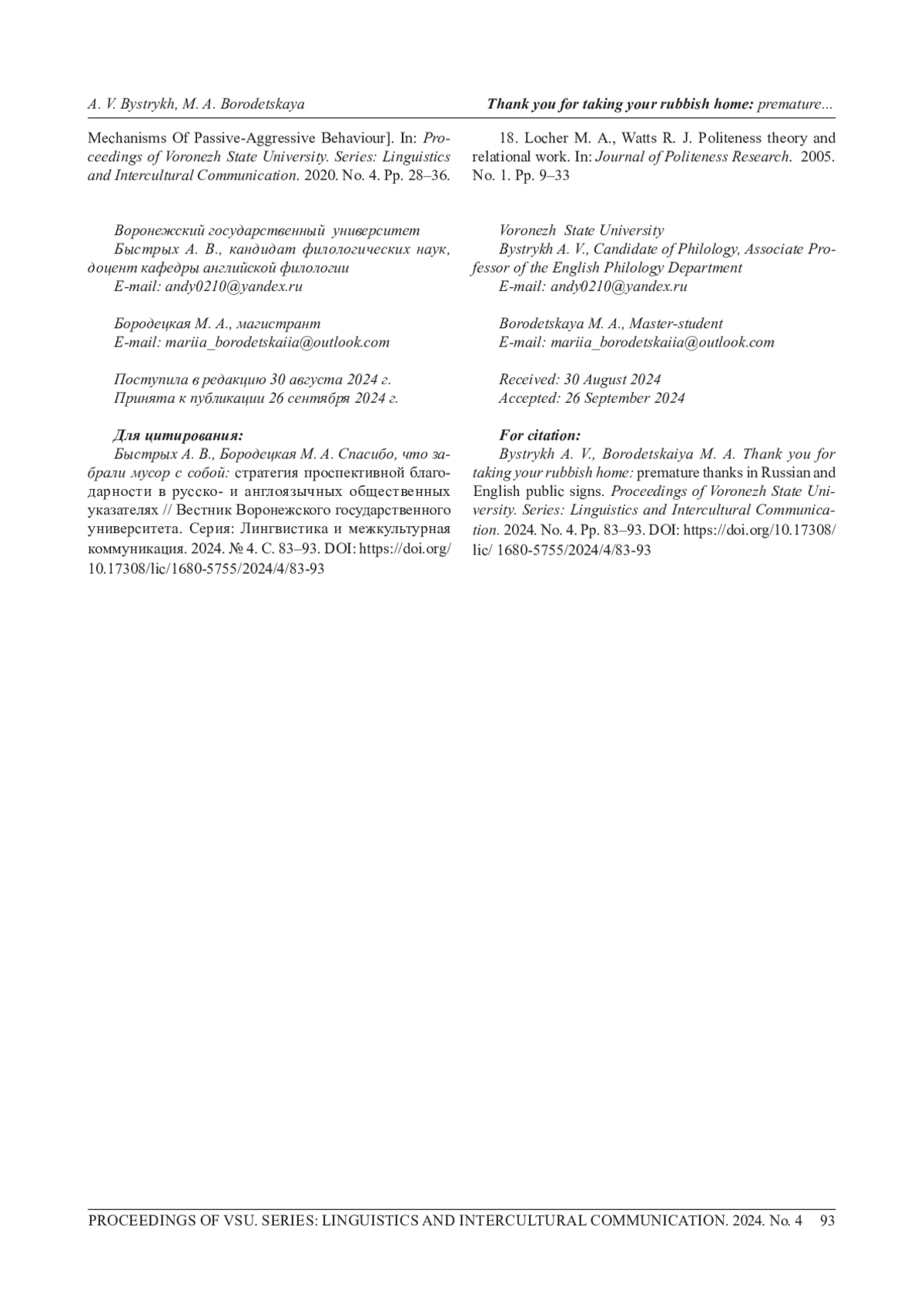 16. 	Быстрых А. В., Высоцкая Е. И. Оксюморон по форме и содержанию: дискурсивные механизмы пассивной агрессии // Вестник Воронеж, гос. ун-та. Сер.: Лингвистика и межкультурная коммуникация. 2020. № 4. С. 28-36.