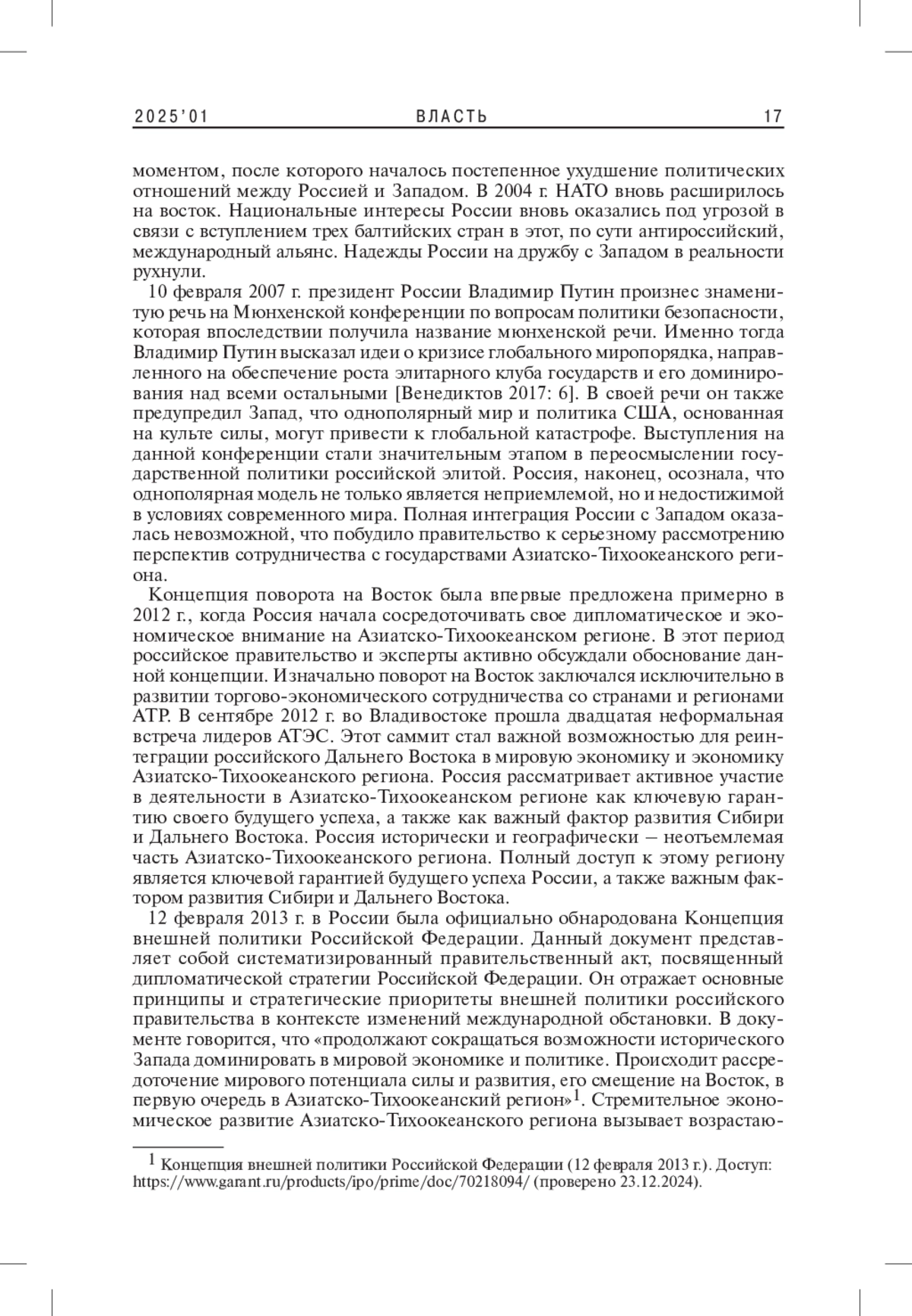 2. 	Венедиктов А.Н. 2017. Мюнхенская конференция по безопасности и векторы российской внешнеполитической стратегии. - Международное сотрудничество евразийских государств: политика, экономика, право. № 1(10). С. 6-14. EDN: ZCIRNT