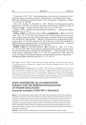8. 	高春雨. 中俄联合办学的课程设置探讨. 黑龙江高教研究 2005 12 P. 166-167. Гао Чуньюй. 2005. Исследование формирования учебных предметов по совместным российско-китайским программам. - Хэйлунцзянское исследование высшего образования. Вып. 12. С. 166-167. Chunyu Gao. 2005. Research on the Formation of Academic Subjects in Joint Russian-Chinese Programmes. - Heilongjiang Higher Education Research. Is. 12. P. 166-167.