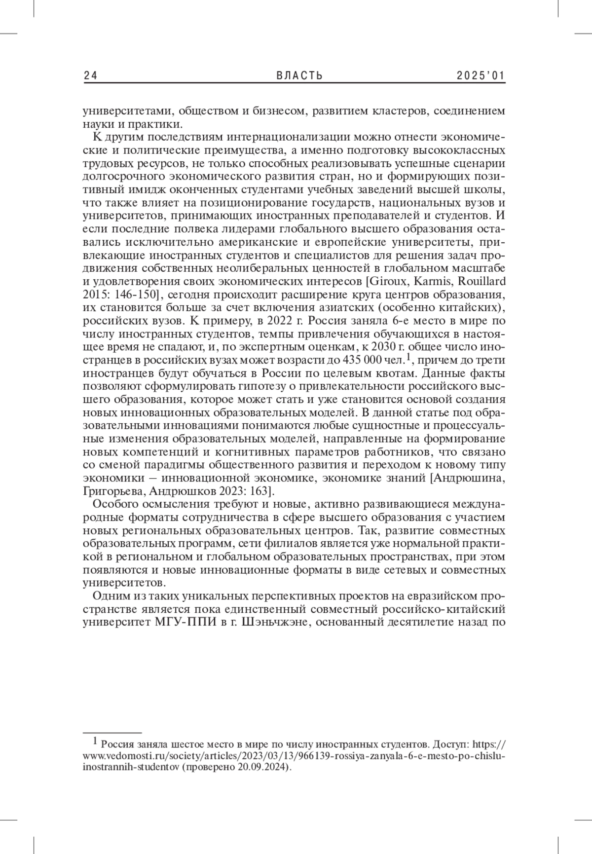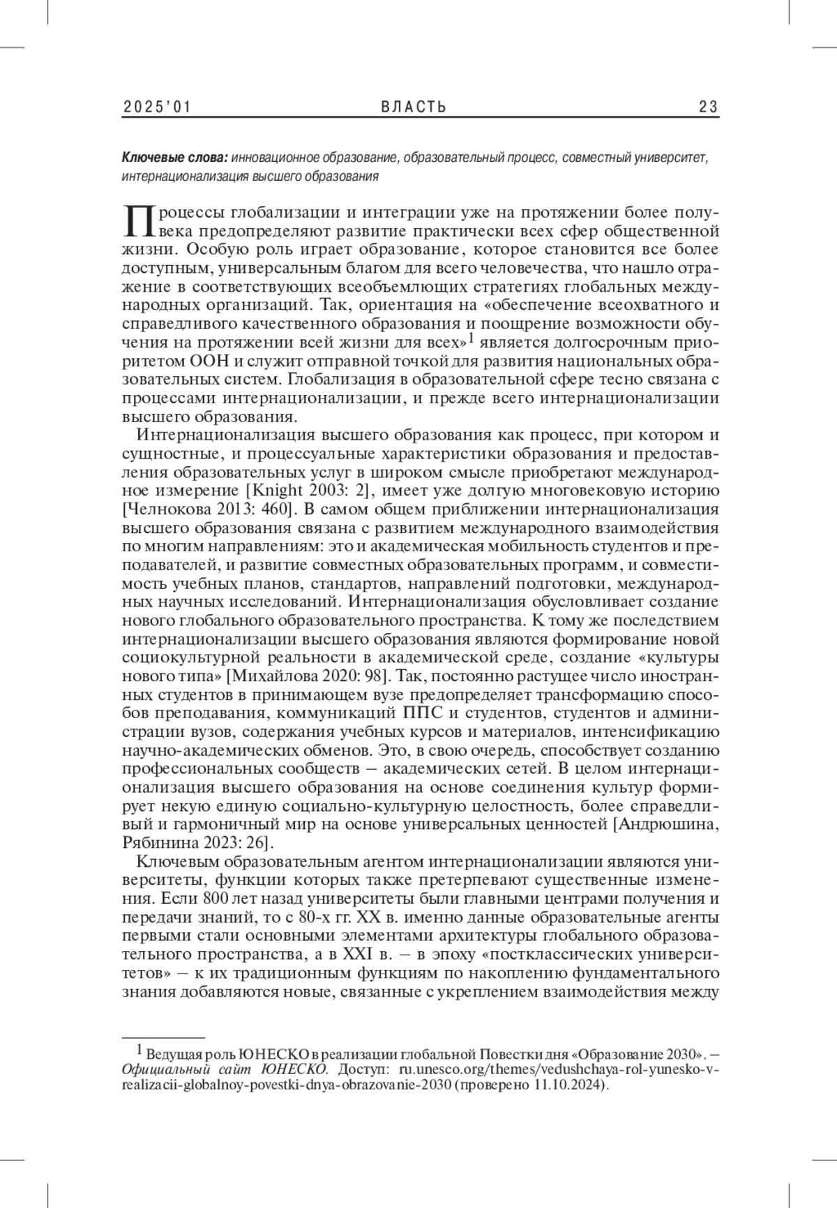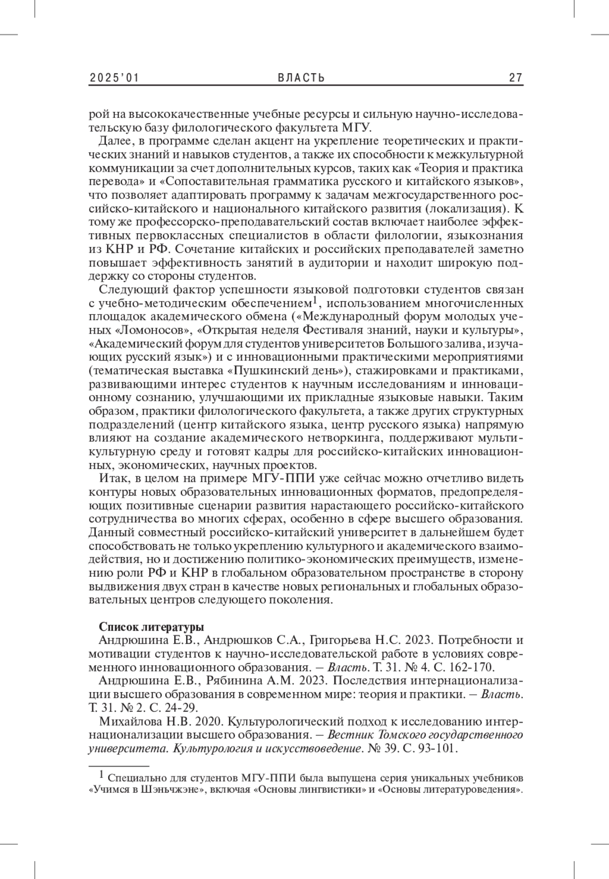 2. 	Андрюшина Е.В., Рябинина А.М. 2023. Последствия интернационализации высшего образования в современном мире: теория и практики. - Власть. Т. 31. № 2. С. 24-29. EDN: WCQIOB