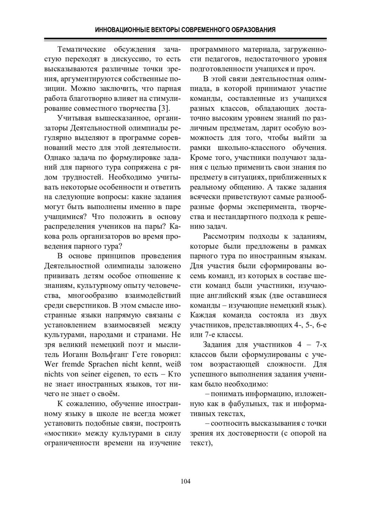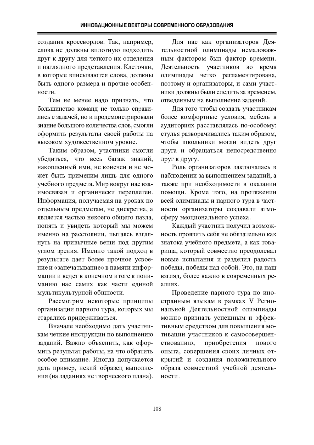 В статье рассмотрены подготовка и проведение парного тура по иностранным языкам в рамках V Деятельностной олимпиады школьников, а также перспективы проведения парных туров в деятельностных олимпиадах школьников. Дана характеристика принципов, лежащих в основе заданий, рассмотрены трудности, которые возникли в процессе подготовки и проведения парного тура по иностранным языкам. Кроме того, дан анализ полученных результатов и предпринята попытка оценить перспективы для последующих деятельностных олимпиад.