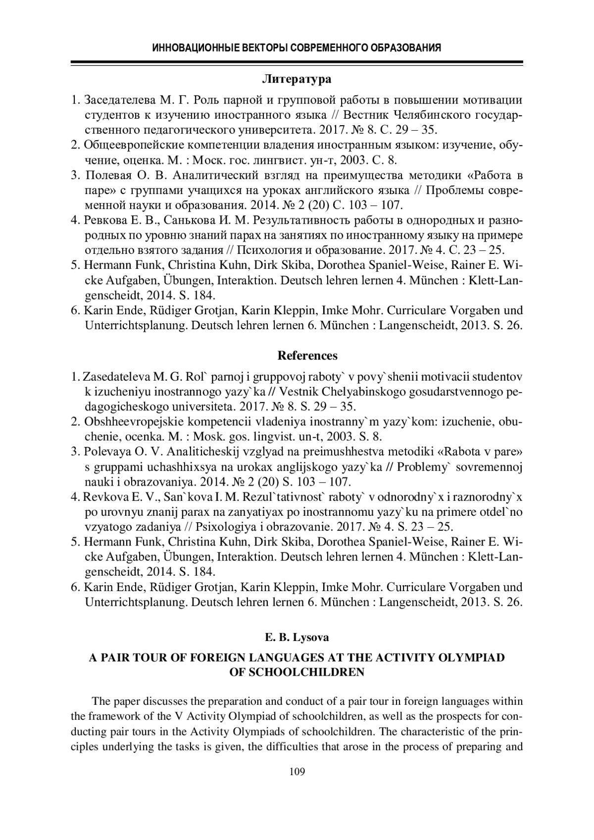 4. Ревкова Е. В., Санькова И. М. Результативность работы в однородных и разнородных по уровню знаний парах на занятиях по иностранному языку на примере отдельно взятого задания // Психология и образование. 2017. № 4. С. 23 - 25.