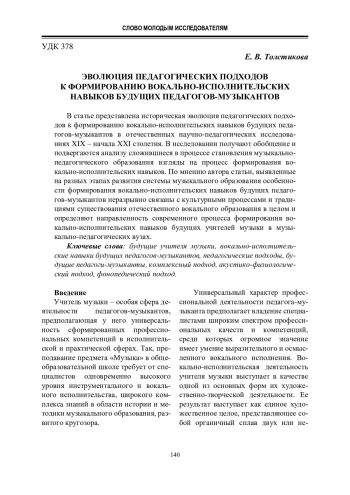В статье представлена историческая эволюция педагогических подходов к формированию вокально-исполнительских навыков будущих педагогов-музыкантов в отечественных научно-педагогических исследованиях XIX – начала XXI столетия. В исследовании получают обобщение и подвергаются анализу сложившиеся в процессе становления музыкально-педагогического образования взгляды на процесс формирования вокально-исполнительских навыков. По мнению автора статьи, выявленные на разных этапах развития системы музыкального образования особенности формирования вокально-исполнительских навыков будущих педагогов-музыкантов неразрывно связаны с культурными процессами и традициями существования отечественного вокального образования в целом и определяют направленность современного процесса формирования вокально-исполнительских навыков будущих учителей музыки в музыкально-педагогических вузах.