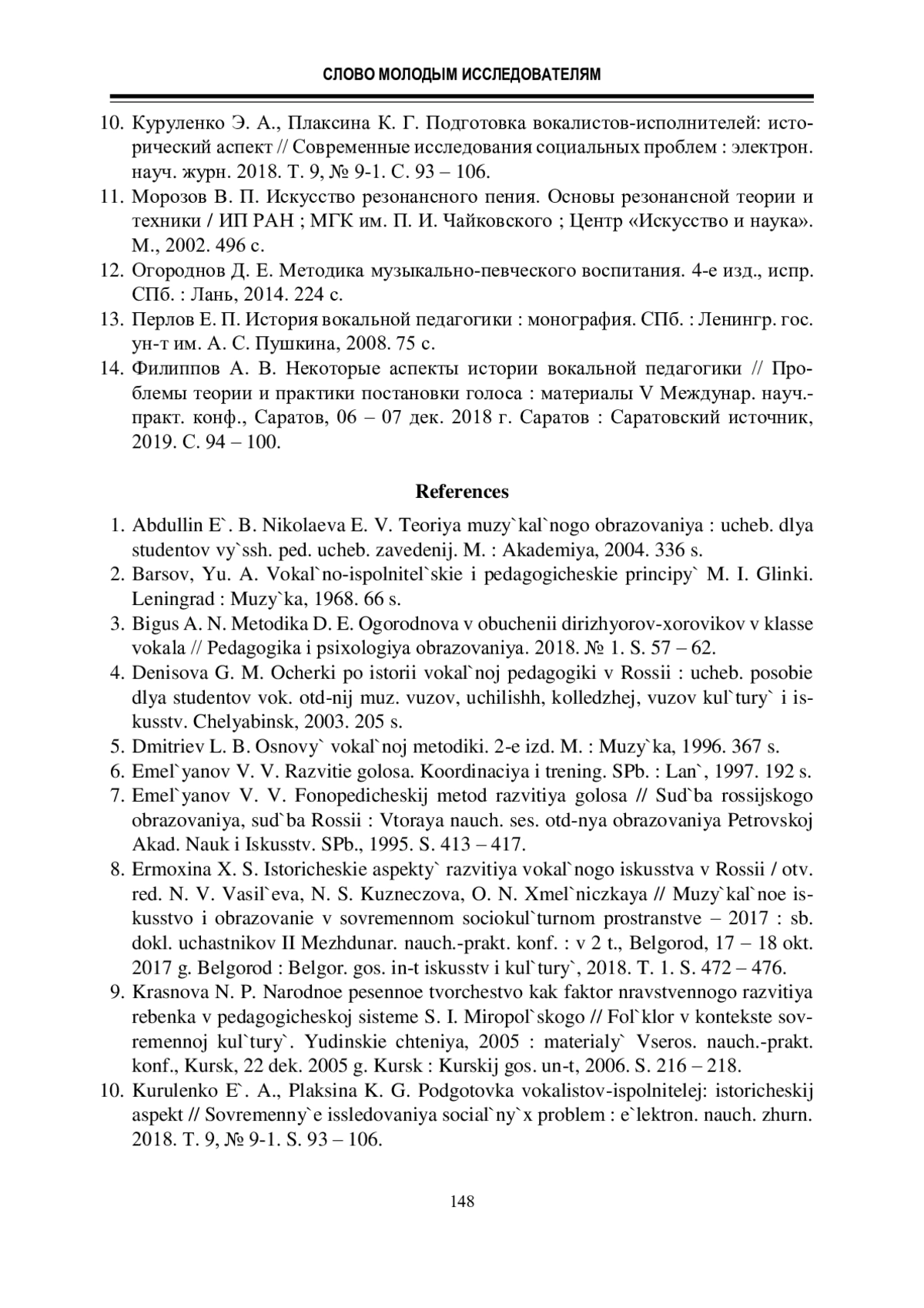 10. Куруленко Э. А., Плаксина К. Г. Подготовка вокалистов-исполнителей: исторический аспект // Современные исследования социальных проблем : электрон. науч. журн. 2018. Т. 9, № 9-1. С. 93 - 106.