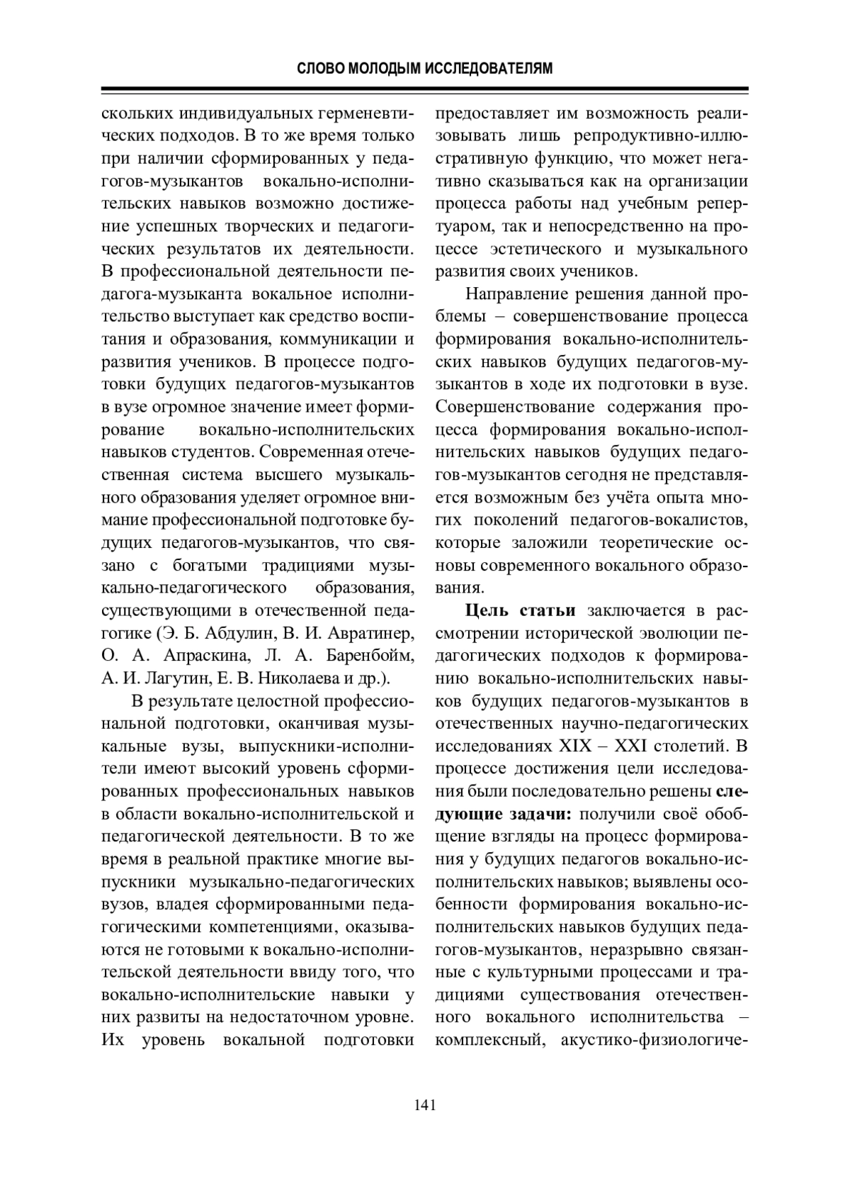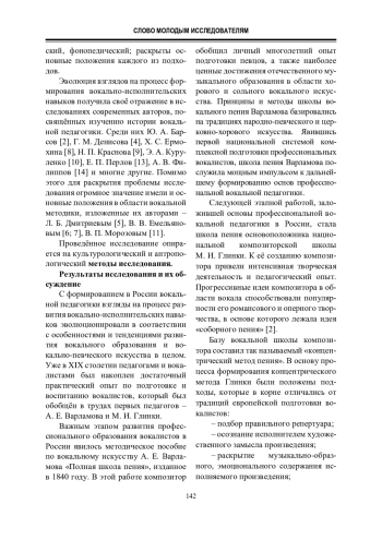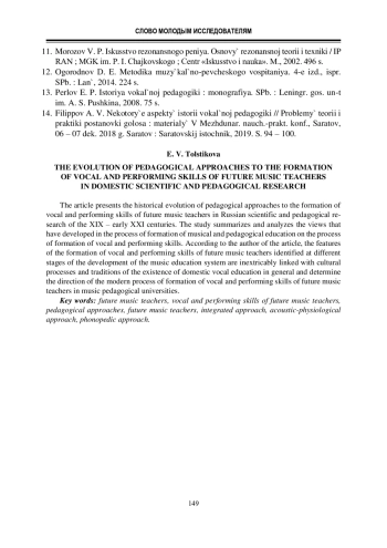 В статье представлена историческая эволюция педагогических подходов к формированию вокально-исполнительских навыков будущих педагогов-музыкантов в отечественных научно-педагогических исследованиях XIX – начала XXI столетия. В исследовании получают обобщение и подвергаются анализу сложившиеся в процессе становления музыкально-педагогического образования взгляды на процесс формирования вокально-исполнительских навыков. По мнению автора статьи, выявленные на разных этапах развития системы музыкального образования особенности формирования вокально-исполнительских навыков будущих педагогов-музыкантов неразрывно связаны с культурными процессами и традициями существования отечественного вокального образования в целом и определяют направленность современного процесса формирования вокально-исполнительских навыков будущих учителей музыки в музыкально-педагогических вузах.