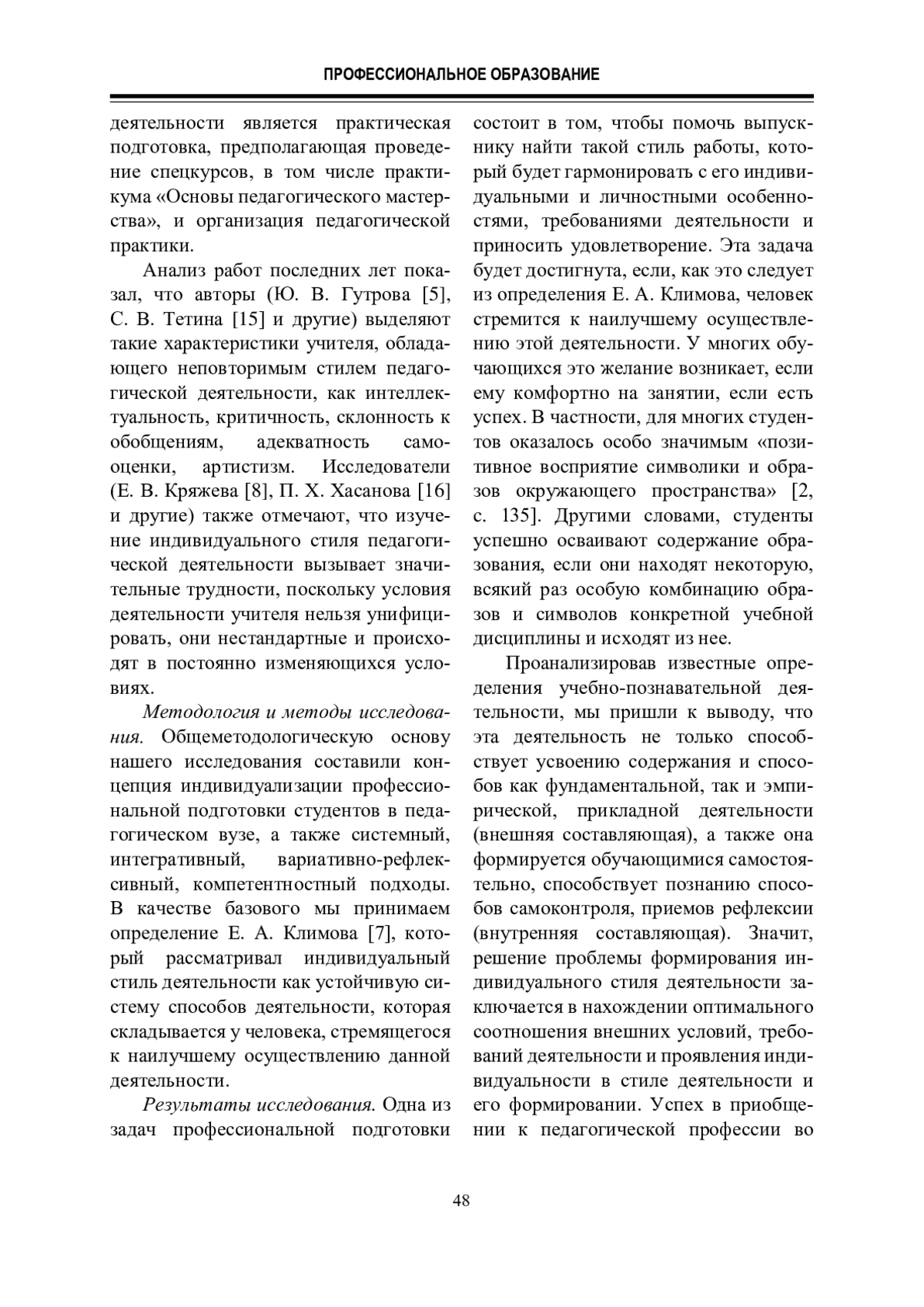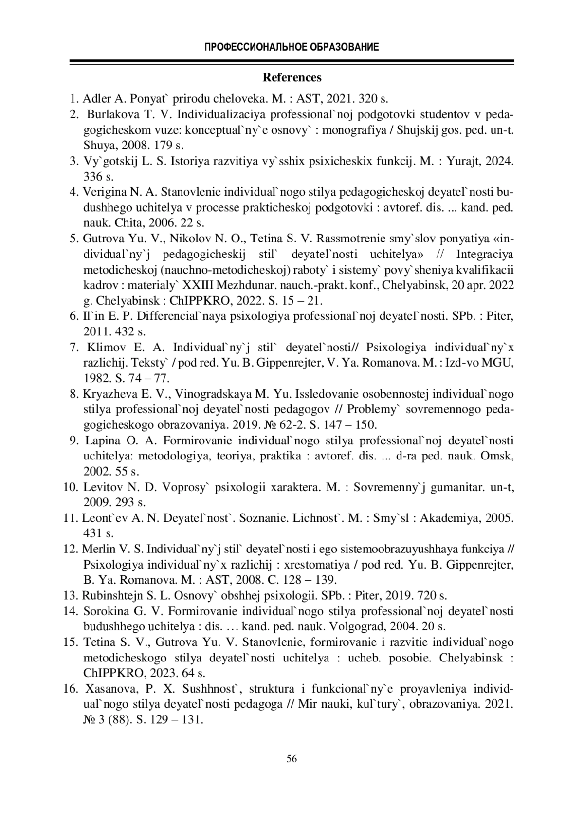 16. Хасанова, П. Х. Сущность, структура и функциональные проявления индивидуального стиля деятельности педагога // Мир науки, культуры, образования. 2021. № 3 (88). С. 129 - 131.