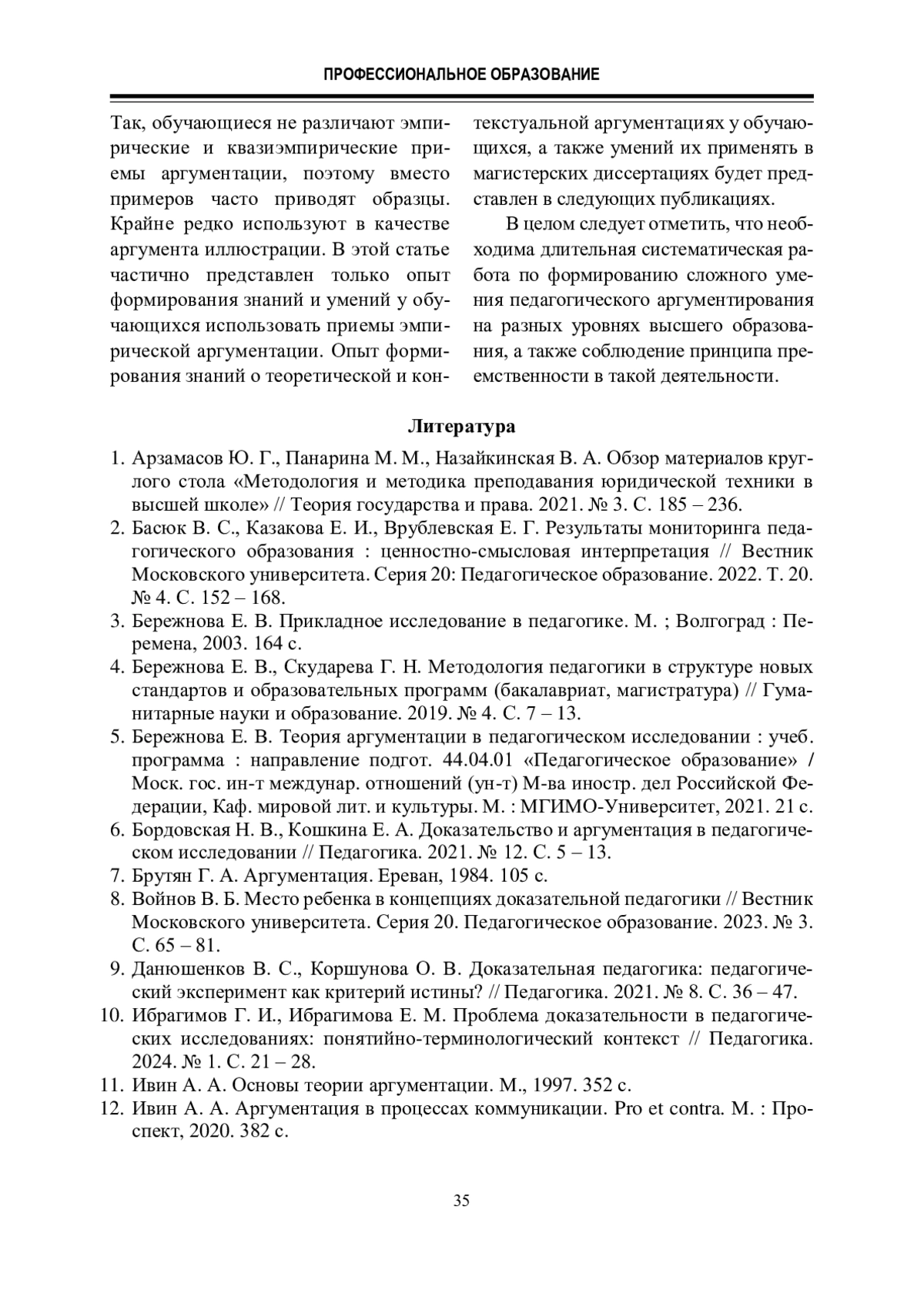 Авторы статьи обращаются к актуальной проблеме, недостаточно решенной в педагогике и вызывающей дискуссии ученых, – это проблема доказательства и аргументации. Они представляют часть своего практического опыта формирования умения аргументировать у обучающихся по магистерским программам. Показаны условия, которые помогают молодым исследователям в овладении знаниями о приемах эмпирической и квазиэмпирической аргументации, а также об особенностях их применения в прикладном педагогическом исследовании.