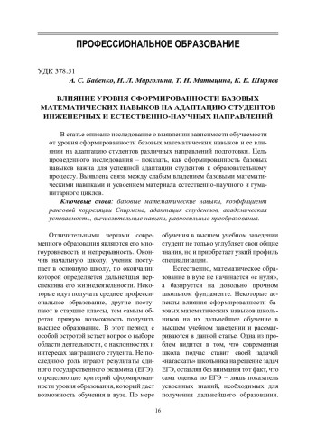 В статье описано исследование о выявлении зависимости обучаемости от уровня сформированности базовых математических навыков и ее влиянии на адаптацию студентов различных направлений подготовки. Цель проведенного исследования – показать, как сформированность базовых навыков важна для успешной адаптации студентов к образовательному процессу. Выявлена связь между слабым владением базовыми математическими навыками и усвоением материала естественно-научного и гуманитарного циклов.