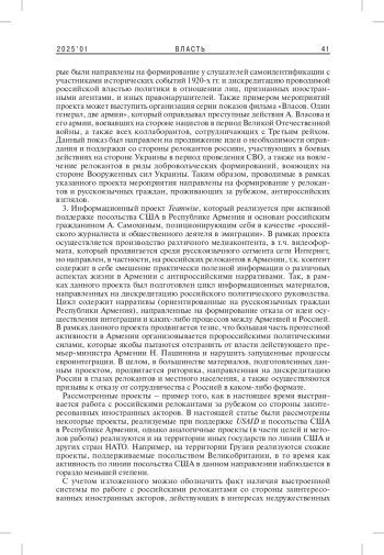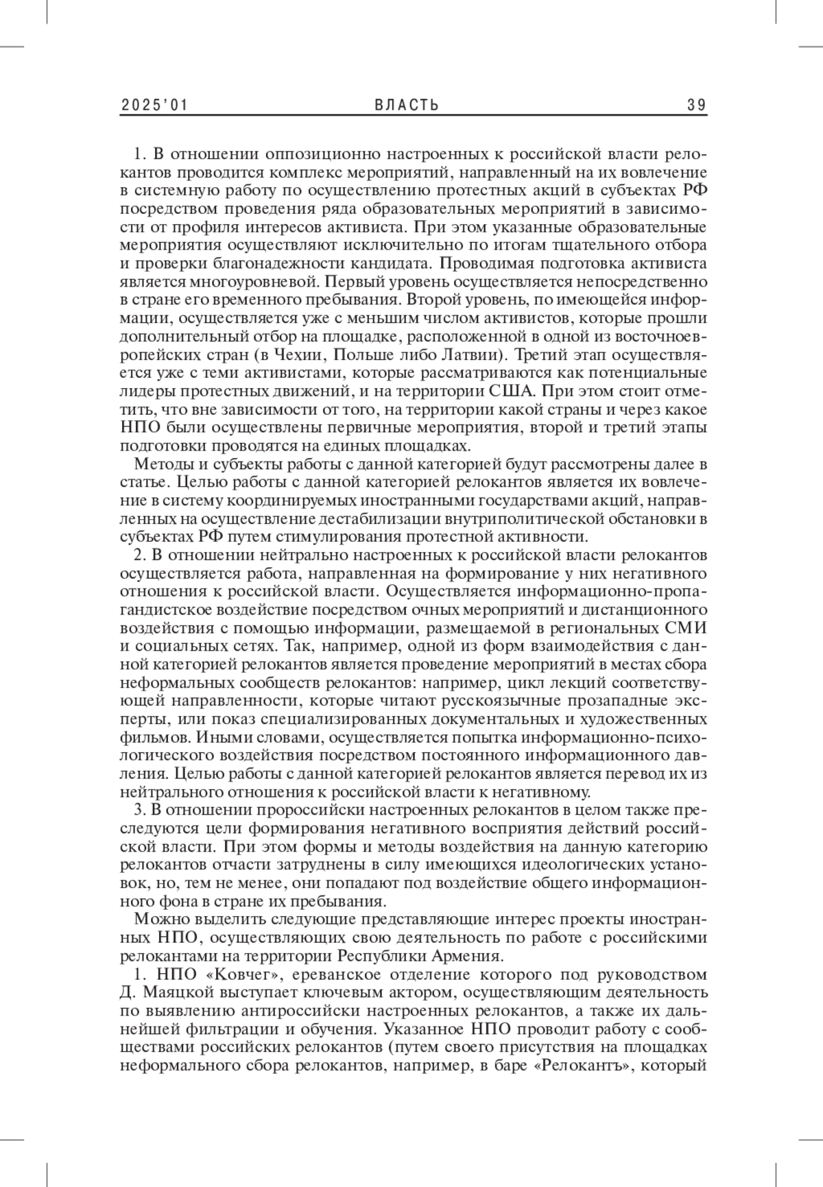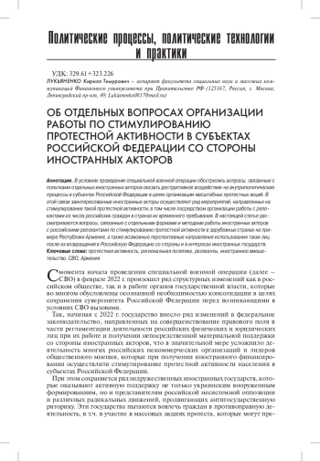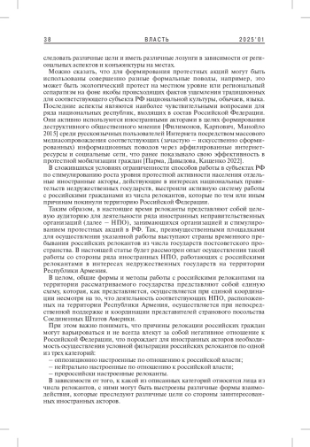 В условиях проведения специальной военной операции обострились вопросы, связанные с попытками отдельных иностранных акторов оказать деструктивное воздействие на внутриполитические процессы в субъектах Российской Федерации в целях организации масштабных протестных акций. В этой связи заинтересованные иностранные акторы осуществляют ряд мероприятий, направленных на стимулирование такой протестной активности, в том числе посредством организации работы с релокантами из числа российских граждан в странах их временного пребывания. В настоящей статье рассматриваются вопросы, связанные с отдельными формами и методами работы иностранных акторов с российскими релокантами по стимулированию протестной активности в зарубежных странах на примере Республики Армения, а также возможные перспективные направления использования таких лиц после их возвращения в Российскую Федерацию со стороны и в интересах иностранных государств.