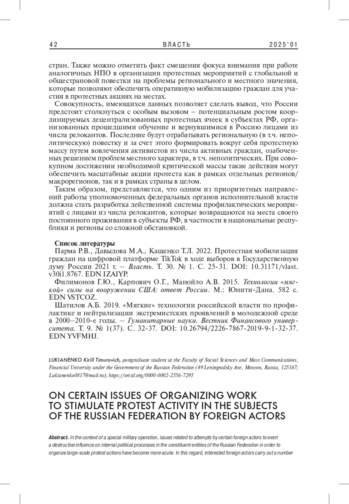 1. 	Парма Р.В., Давыдова М.А., Кащенко Т.Л. 2022. Протестная мобилизация граждан на цифровой платформе TikTok в ходе выборов в Государственную думу России 2021 г. - Власть. Т. 30. № 1. С. 25-31. DOI: 10.31171/vlast.v30i1.8767 EDN: IZAIYP