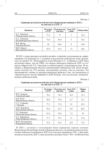 В статье рассматривается влияние фактора ДЭГ на результаты губернаторских выборов в России за период 2022-2024 гг. На основе кросс-регионального и кросс-темпорального анализа электоральной статистики автор показывает, что только в 7 случаев из 18 электоральная поддержка лидера выборов была выше при ДЭГ, чем при голосовании на избирательных участках.