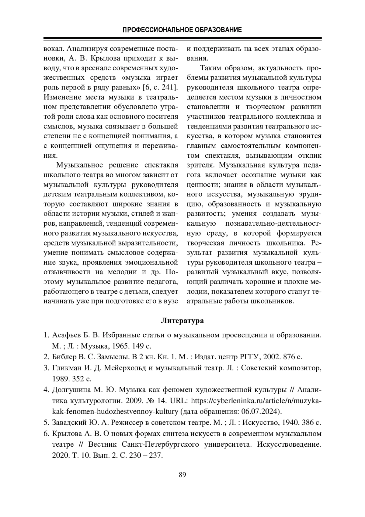 6. Крылова А. В. О новых формах синтеза искусств в современном музыкальном театре // Вестник Санкт-Петербургского университета. Искусствоведение. 2020. Т. 10. Вып. 2. С. 230 - 237.