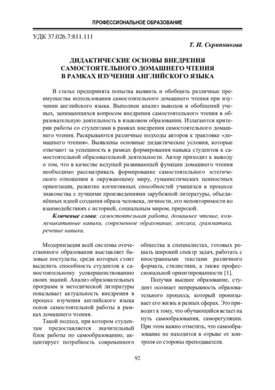 В статье предпринята попытка выявить и обобщить различные преимущества использования самостоятельного домашнего чтения при изучении английского языка. Выполнен анализ выводов и обобщений ученых, занимающихся вопросом внедрения самостоятельного чтения в образовательную деятельность в языковом образовании. Излагаются критерии работы со студентами в рамках внедрения самостоятельного домашнего чтения. Раскрываются различные подходы авторов к трактовке «домашнего чтения». Выявлены основные дидактические условия, которые отвечают за успешность в рамках формирования навыка студентов к самостоятельной образовательной деятельности. Автор приходит к выводу о том, что в качестве ведущей развивающей функции домашнего чтения необходимо рассматривать формирование самостоятельного эстетического отношения к окружающему миру, гуманистических ценностных ориентации, развитие когнитивных способностей учащихся в процессе знакомства с лучшими произведениями зарубежной литературы, объединённых идеей создания образа человека, личности, его неповторимости во взаимодействиях с историей, социальным миром, природой.
