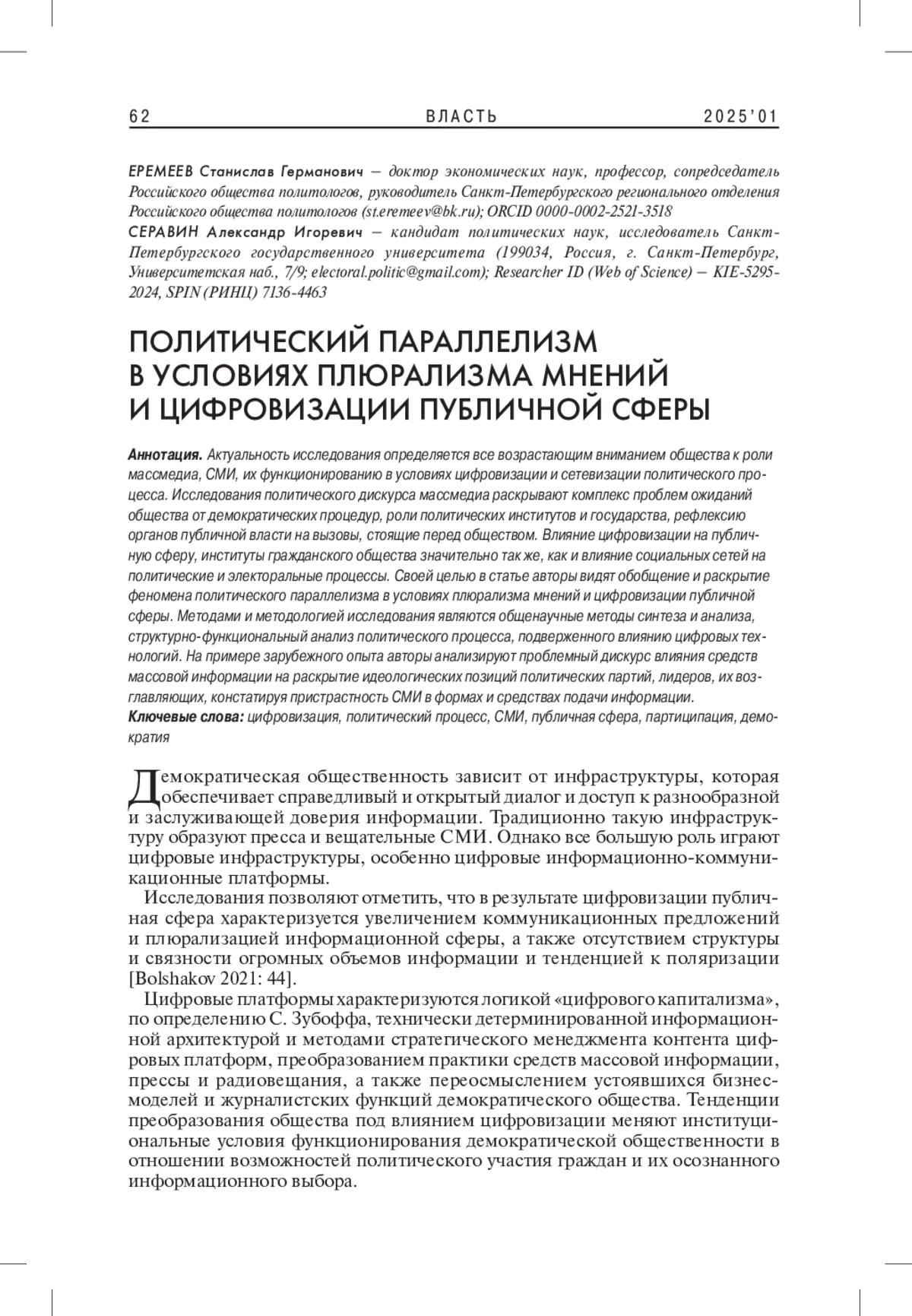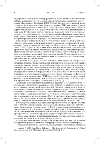 Актуальность исследования определяется все возрастающим вниманием общества к роли массмедиа, СМИ, их функционированию в условиях цифровизации и сетевизации политического процесса. Исследования политического дискурса массмедиа раскрывают комплекс проблем ожиданий общества от демократических процедур, роли политических институтов и государства, рефлексию органов публичной власти на вызовы, стоящие перед обществом. Влияние цифровизации на публичную сферу, институты гражданского общества значительно так же, как и влияние социальных сетей на политические и электоральные процессы. Своей целью в статье авторы видят обобщение и раскрытие феномена политического параллелизма в условиях плюрализма мнений и цифровизации публичной сферы. Методами и методологией исследования являются общенаучные методы синтеза и анализа, структурно-функциональный анализ политического процесса, подверженного влиянию цифровых технологий. На примере зарубежного опыта авторы анализируют проблемный дискурс влияния средств массовой информации на раскрытие идеологических позиций политических партий, лидеров, их возглавляющих, констатируя пристрастность СМИ в формах и средствах подачи информации.