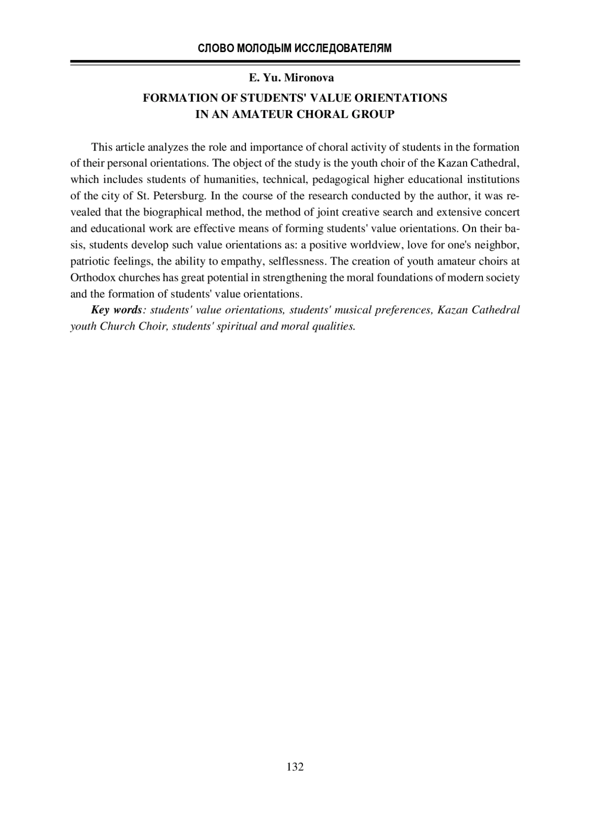 7. Миронова Е. Ю. Музыкальные традиции православной культуры в воспитании молодёжи // Вестник Санкт-Петербургского государственного института культуры. 2023. № 2. С. 44 - 48.