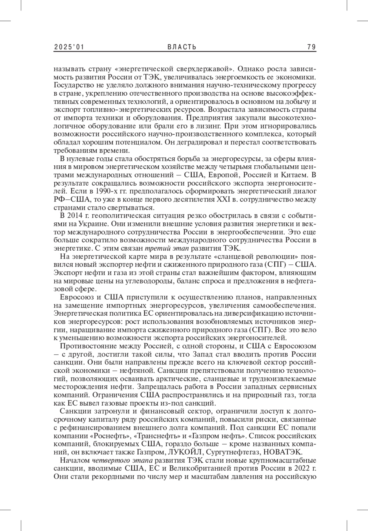 В статье выделяются четыре основных этапа развития топливно-энергетического комплекса (ТЭК) России после распада СССР. Каждый из этих этапов отличается степенью участия государства и бизнеса, уровнем международного сотрудничества в развитии российской энергетики. Показана смена подходов в управлении ТЭК - от чрезмерного либерализма 1990-х гг. к усилению централизации управления ТЭК, увеличению доли государственного присутствия в нефтяных компаниях и Газпроме. Санкции вносят новые кардинальные изменения в развитие энергетики, существенно меняют цели и задачи российского ТЭК, механизмы их реализации. Рассматриваются новые угрозы и вызовы эффективному развитию страны на основе экспортно-сырьевой модели хозяйствования в условиях новой геополитической ситуации и крупномасштабных санкций.