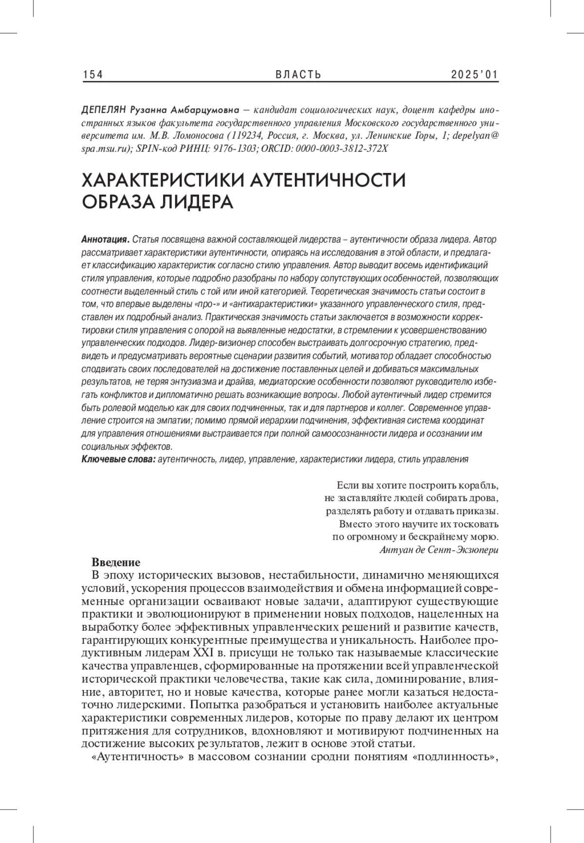 Статья посвящена важной составляющей лидерства - аутентичности образа лидера. Автор рассматривает характеристики аутентичности, опираясь на исследования в этой области, и предлагает классификацию характеристик согласно стилю управления. Автор выводит восемь идентификаций стиля управления, которые подробно разобраны по набору сопутствующих особенностей, позволяющих соотнести выделенный стиль с той или иной категорией. Теоретическая значимость статьи состоит в том, что впервые выделены «про-» и «антихарактеристики» указанного управленческого стиля, представлен их подробный анализ. Практическая значимость статьи заключается в возможности корректировки стиля управления с опорой на выявленные недостатки, в стремлении к усовершенствованию управленческих подходов. Лидер-визионер способен выстраивать долгосрочную стратегию, предвидеть и предусматривать вероятные сценарии развития событий, мотиватор обладает способностью сподвигать своих последователей на достижение поставленных целей и добиваться максимальных результатов, не теряя энтузиазма и драйва, медиаторские особенности позволяют руководителю избегать конфликтов и дипломатично решать возникающие вопросы. Любой аутентичный лидер стремится быть ролевой моделью как для своих подчиненных, так и для партнеров и коллег. Современное управление строится на эмпатии; помимо прямой иерархии подчинения, эффективная система координат для управления отношениями выстраивается при полной самоосознанности лидера и осознании им социальных эффектов.