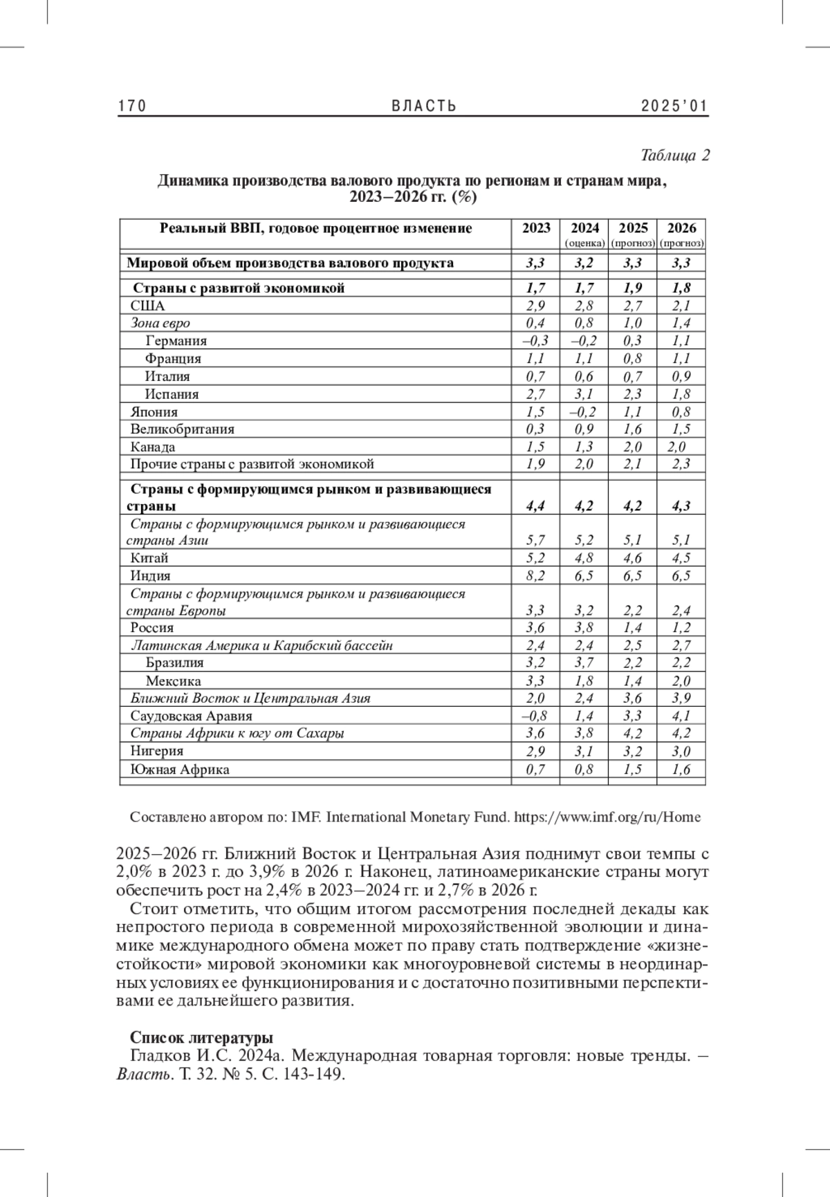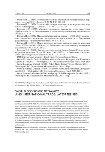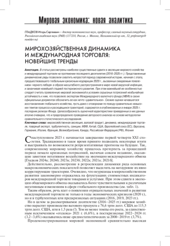 3. 	Гладков И.С. 2023а. Мирохозяйственная динамика и международная торговля: новые тренды. - Власть. Т. 31. № 1. С. 142-147. EDN: IRAAST