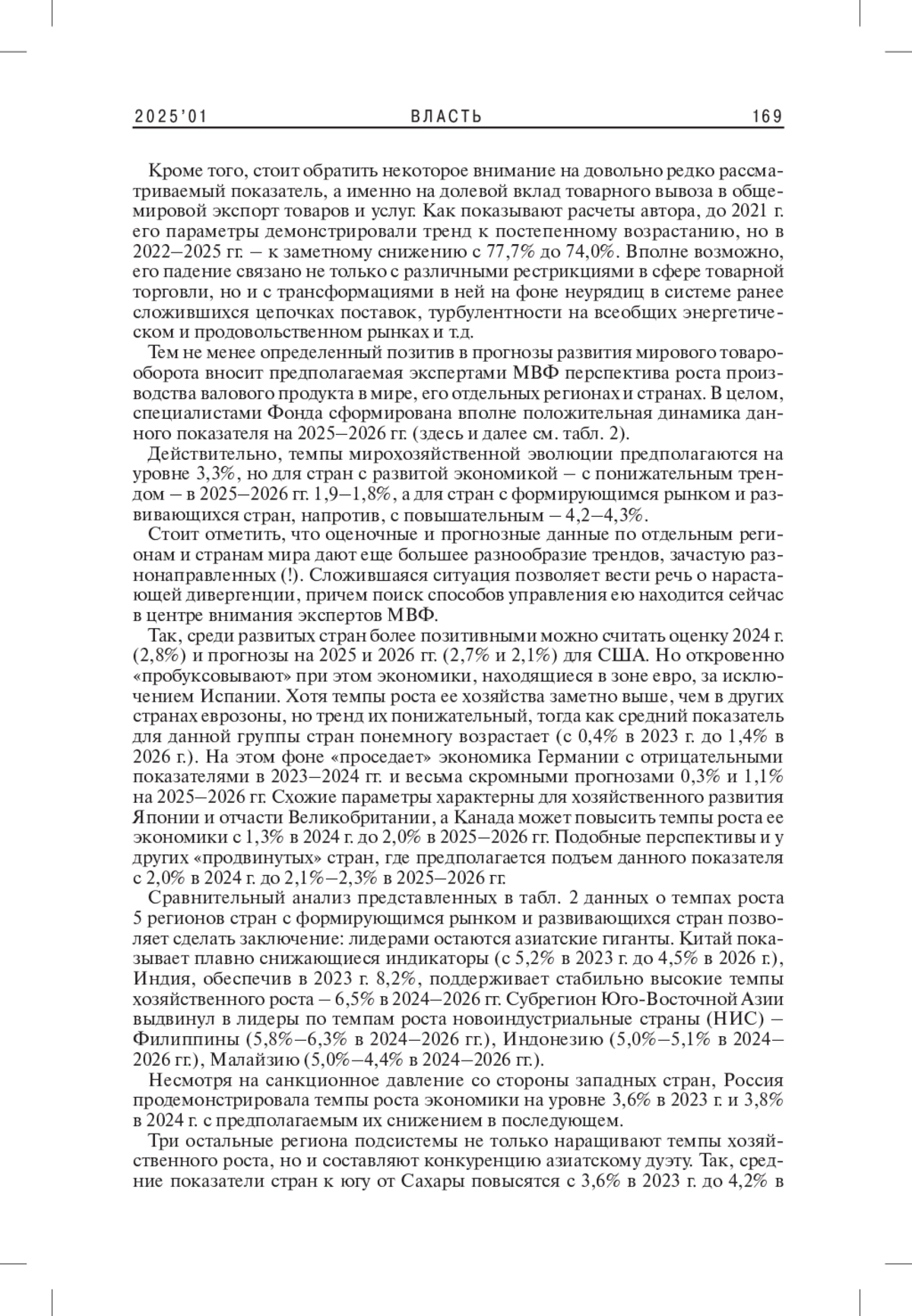 В статье рассмотрены наиболее существенные сдвиги в эволюции мирового хозяйства и международной торговли на протяжении последнего десятилетия (2016-2025 гг.). Представленные динамические ряды позволили охватить непростой период современной истории, начиная с этапа, предшествовавшего глобальным кризисным неурядицам 2020 г., вызванных ожидаемым появлением «черного лебедя» в образе масштабного распространения в мире новой вирусной инфекции, и заканчивая новейшей стадией посткризисного развития. При этом важнейшей ее особенностью следует считать проявленную мировой экономикой в условиях серьезных потрясений необычайную устойчивость к ним, что позволило экспертам Международного валютного фонда (МВФ) в своих официальных документах обозначить ее как нечто «удивительное». Схожие оценки начавшегося восстановления глобального хозяйства, пусть даже с оговорками по поводу сравнительно невысоких темпов процесса и расходящихся траекторий, содержатся в опубликованных в январе 2025 г. последних релизах Фонда. Целесообразность оценочной характеристики приведенных в них данных вполне очевидна, что и предопределило проведение авторского анализа на основе методологии сравнительного статистического исследования.
